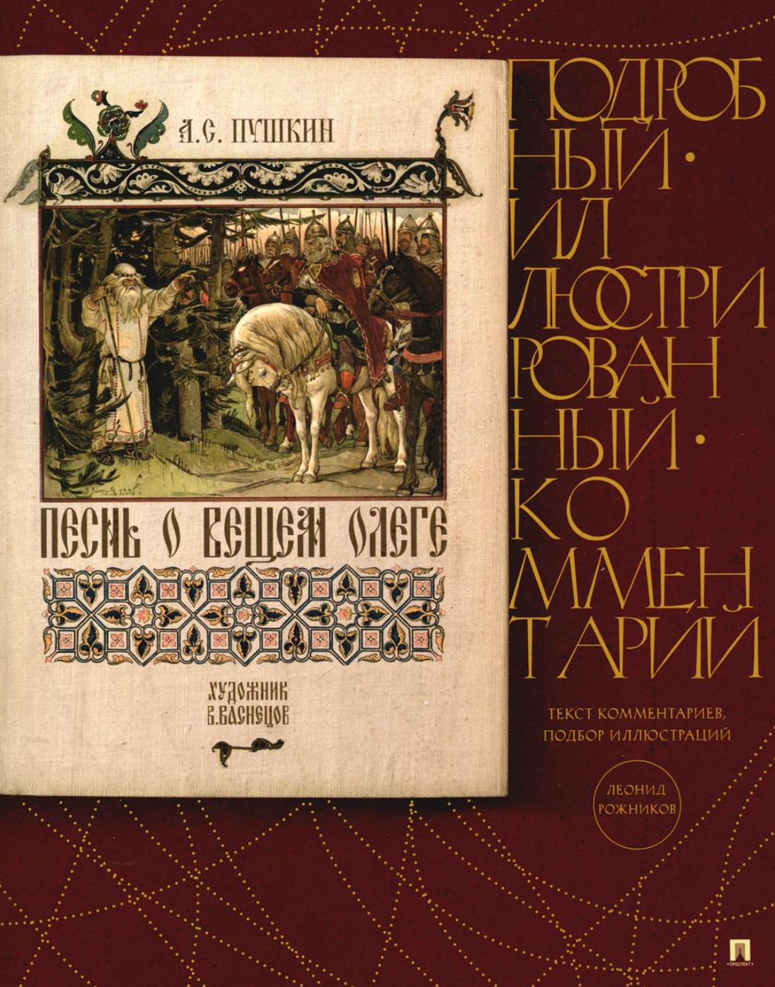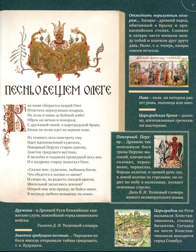 "Book within a book" includes the text of Alexander Sergeyevich Pushkin's famous ballad "The Song of Prophetic Oleg" and page-by-page explanations of complex terms and names found in the narrative. The design of the inner book (except for the text of the poems) is reproduced from the 1899 anniversary edition with classic illustrations by Viktor Vasnetsov.