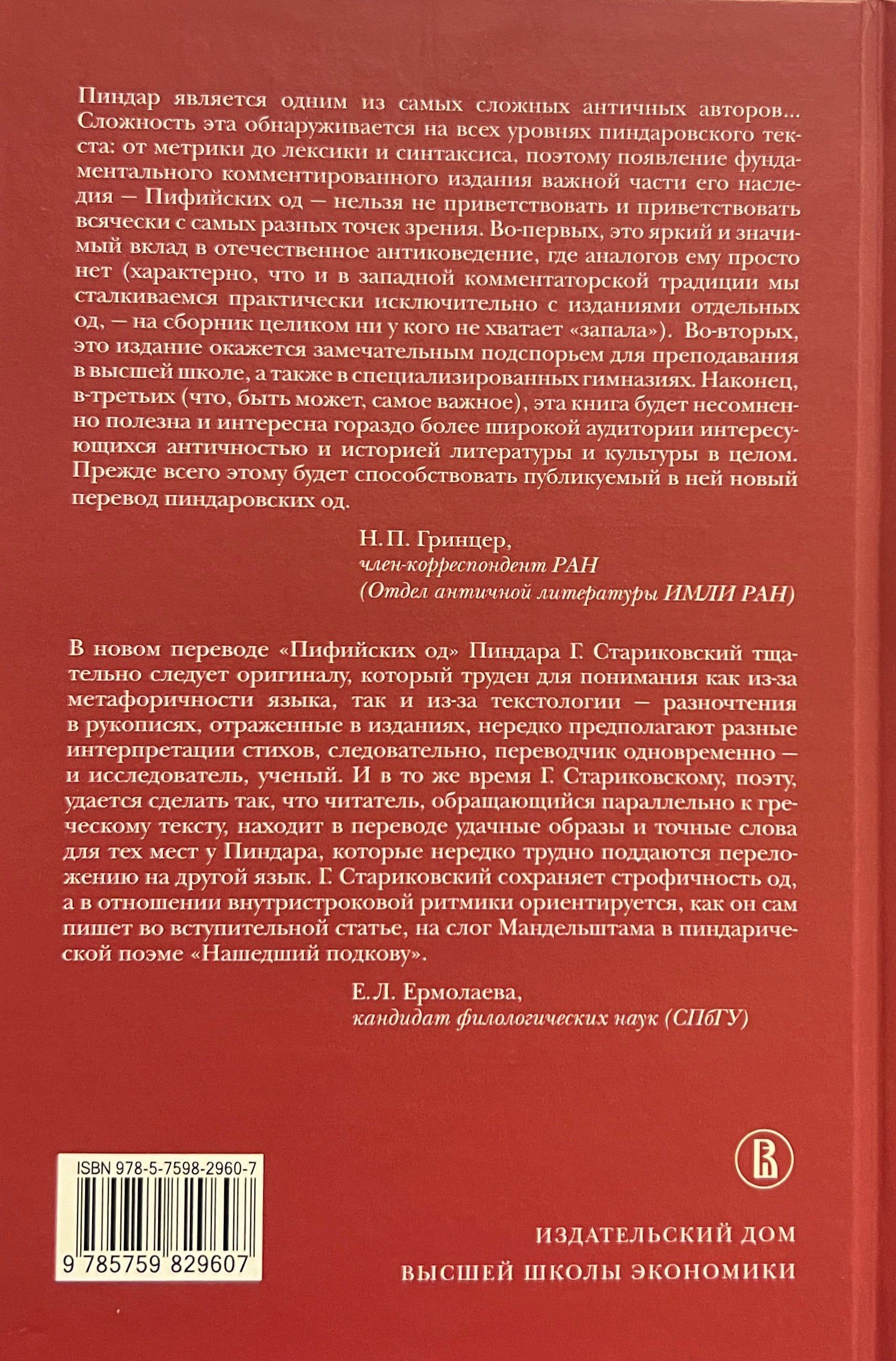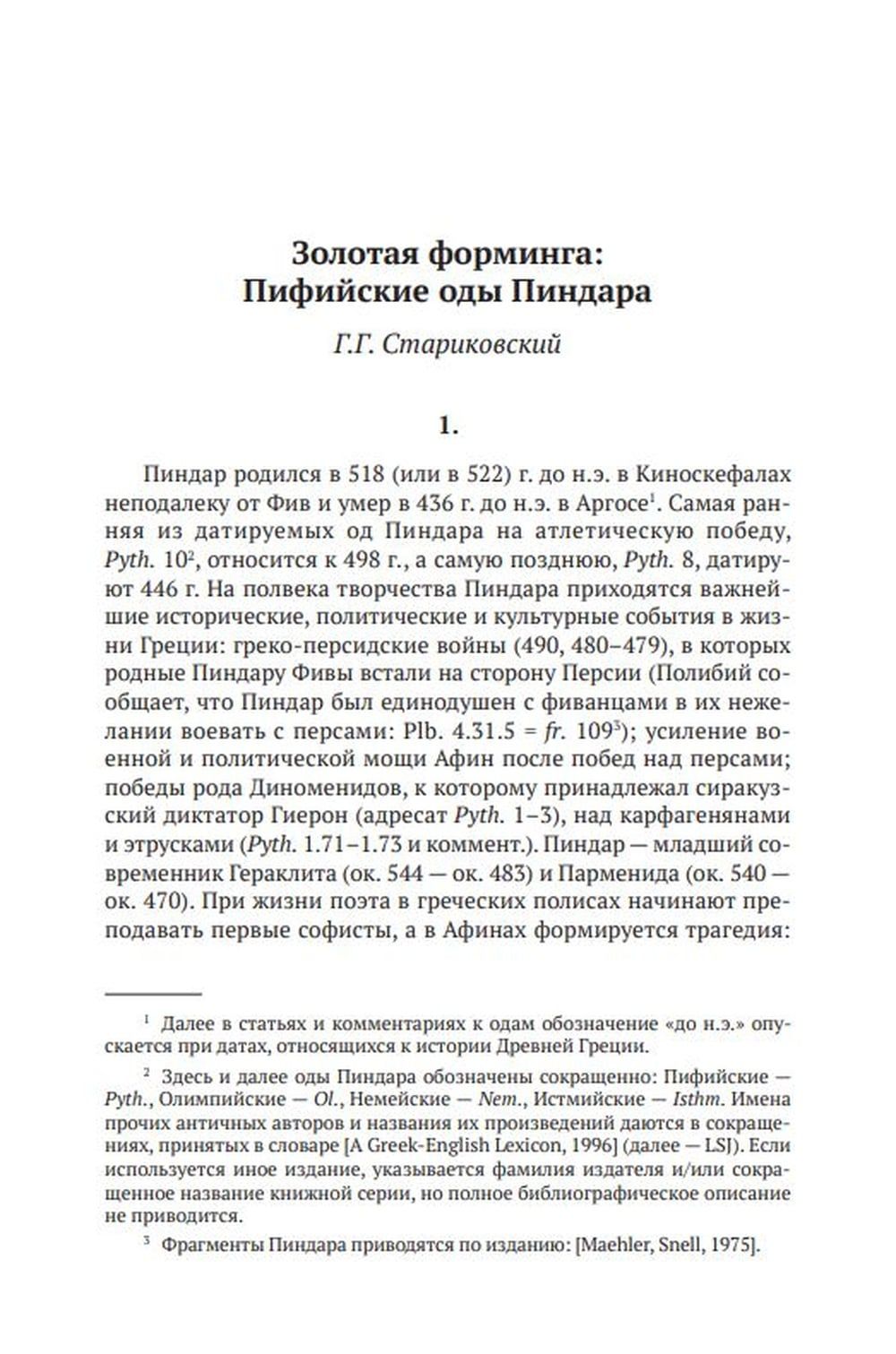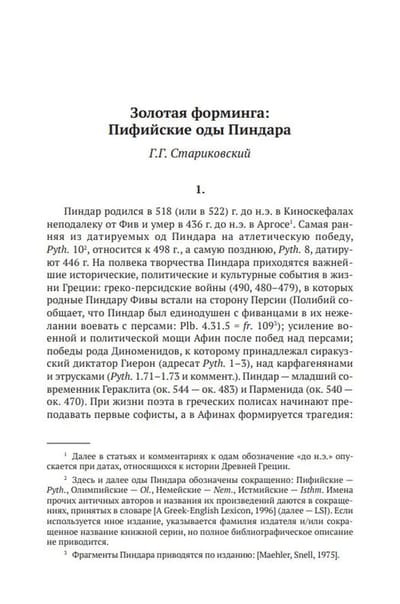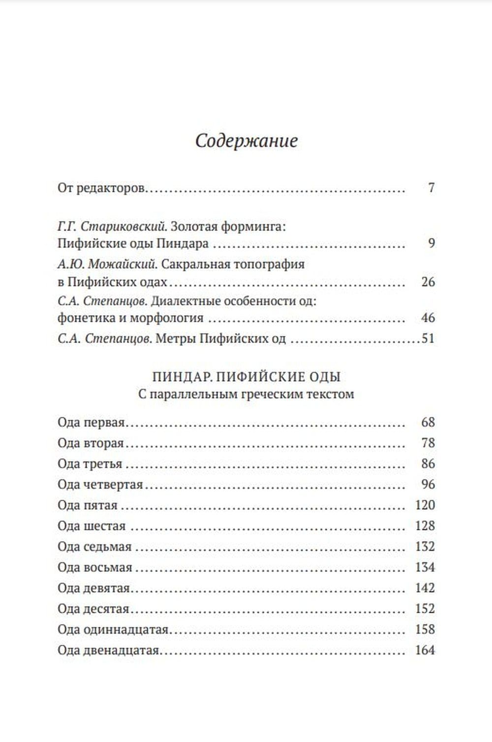 The book includes a new translation of the Pythian Odes with a parallel Greek text, a detailed commentary supplemented by an index of proper names and ethnonyms, as well as research and auxiliary materials that help to navigate the peculiarities of Pindar's poetics, which predetermined the difficulties of translating his texts, to understand the sacred topography of the odes, their dialectal and metric specifics.