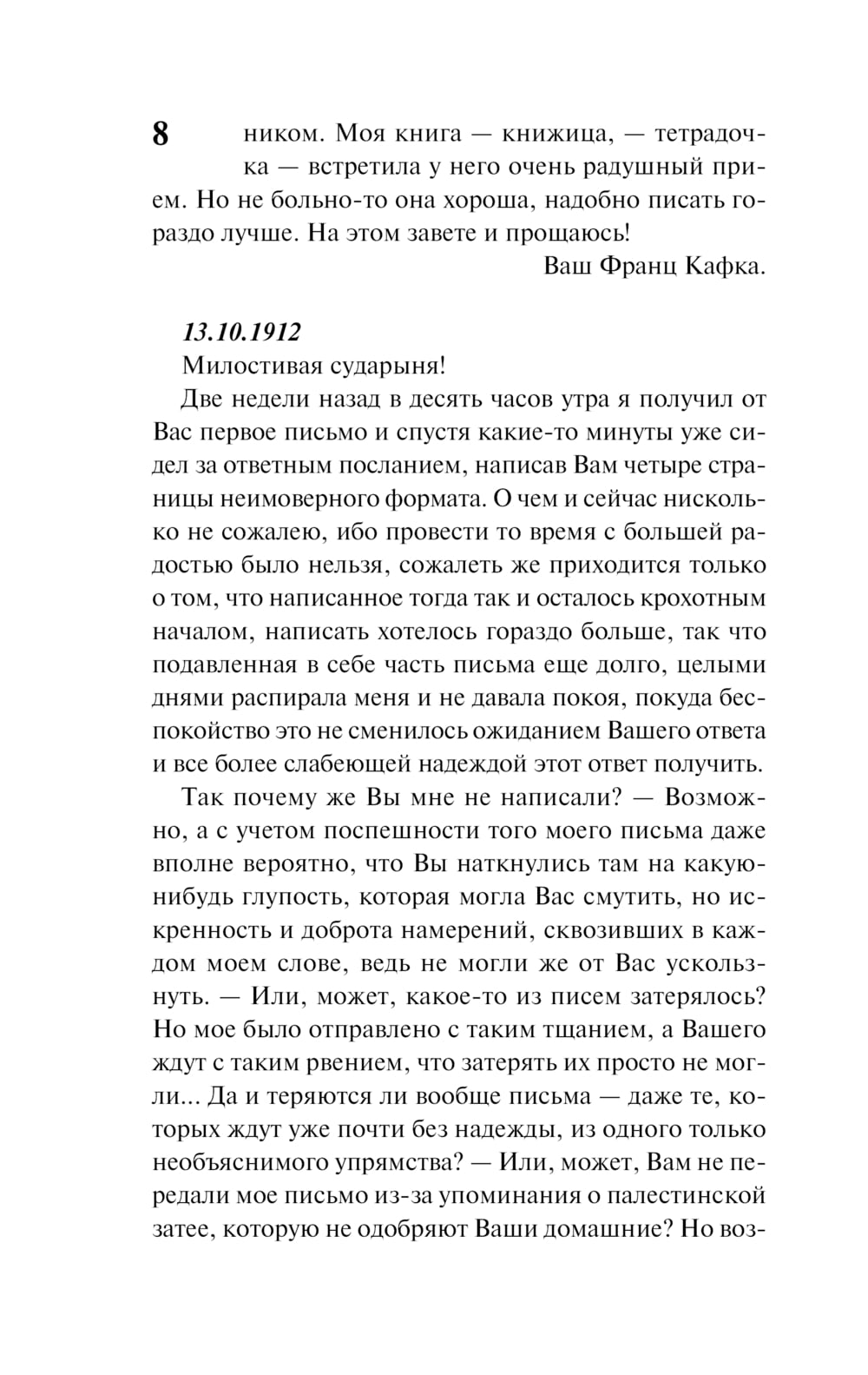 This is a collection of letters from Franz Kafka to his fiancée Felicia Bauer, whose relationship with him was far from simple and never became family. Each of these letters is a document of extreme psychological nakedness of the addressees. The reader will get acquainted with a completely different Franz Kafka: a vulnerable, insecure young man, tormented by all-consuming feelings, experiencing and analyzing them.
