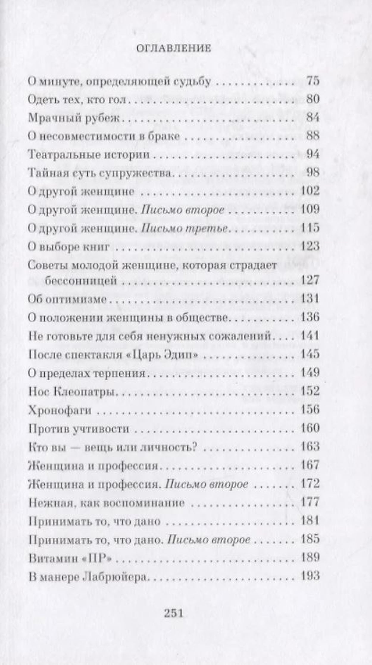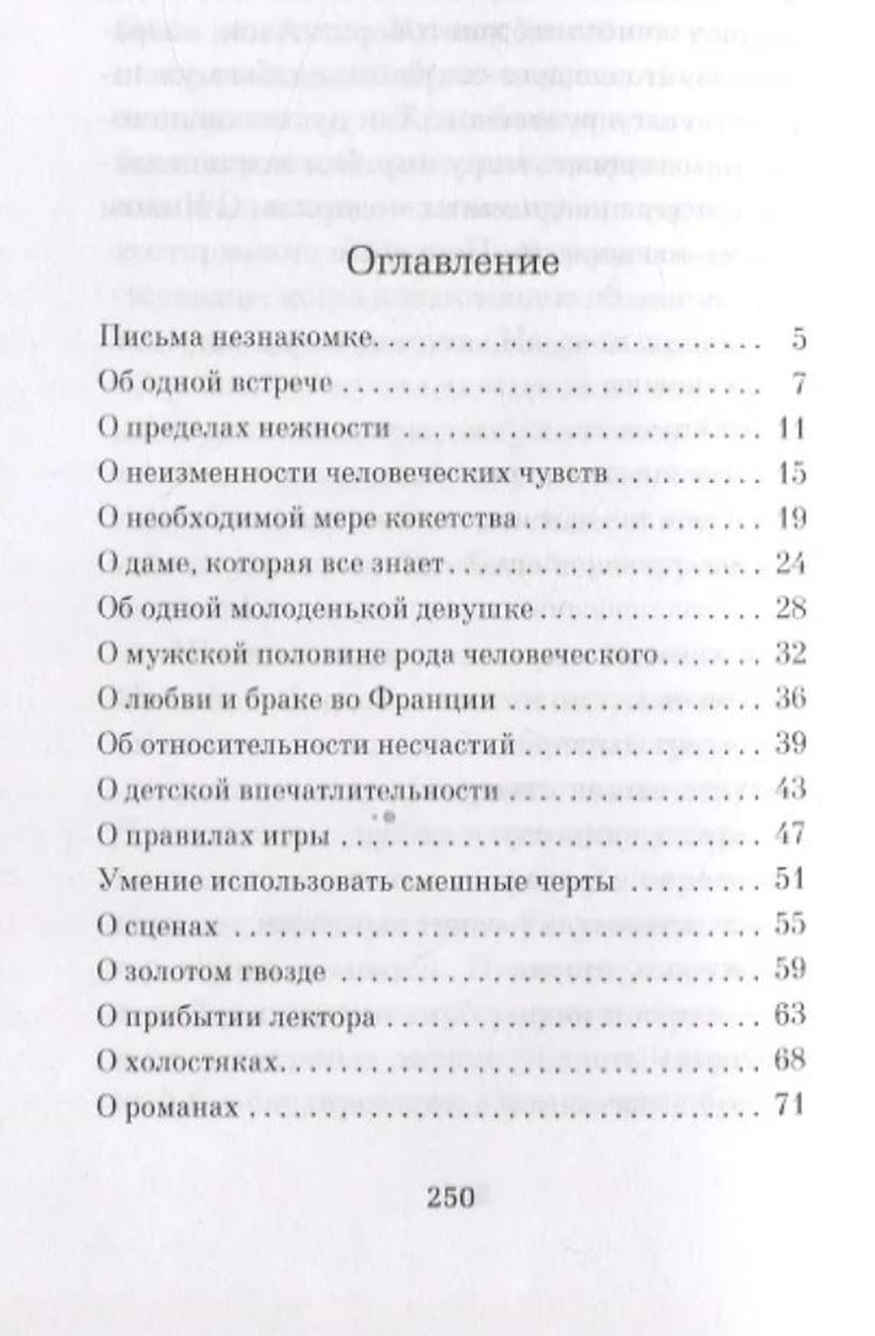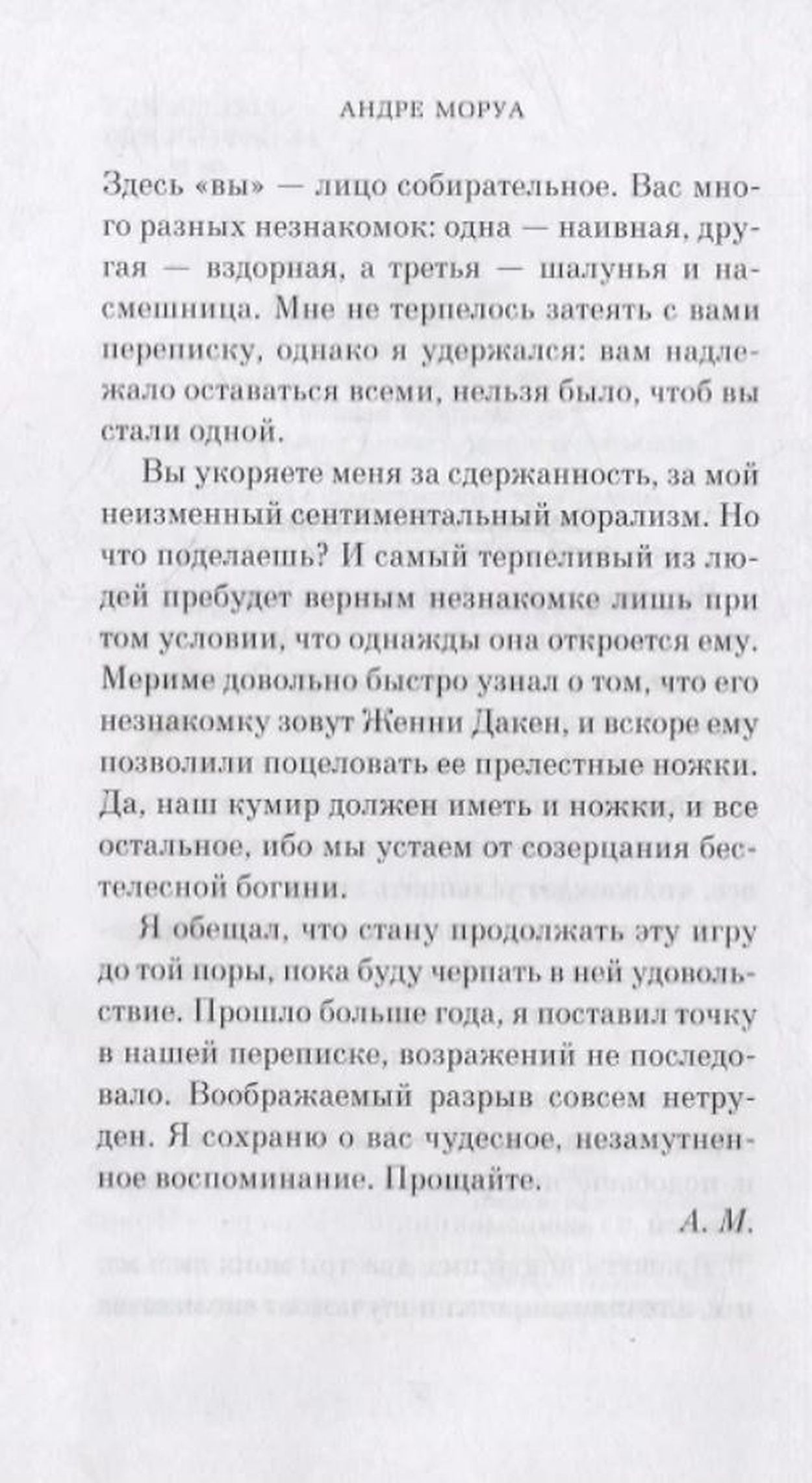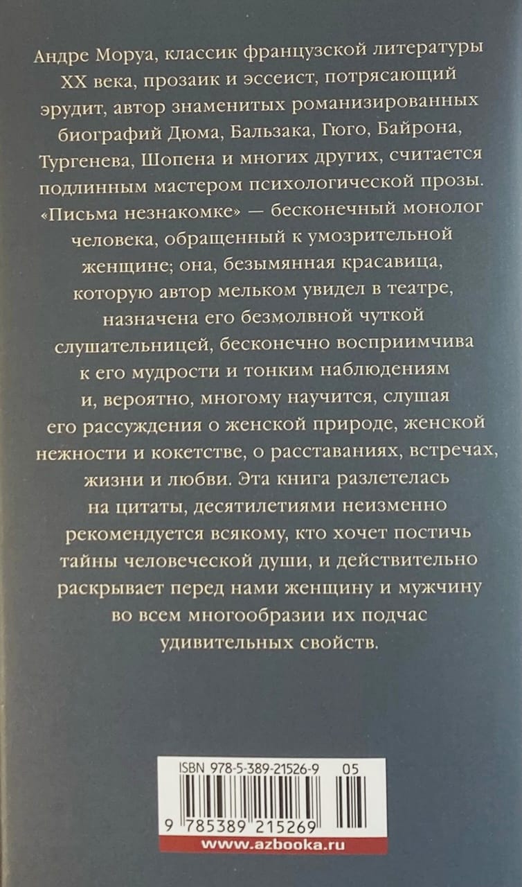 Andre Morois, a classic of French literature of the XX century, novelist and essayist, a terrific polymath, author of famous novelized biographies of Dumas, Balzac, Hugo, Byron, Turgenev, Chopin and many others, is considered a true master of psychological prose. "Letters to a Stranger" - an endless monologue of a man addressed to a speculative woman - she, a nameless beauty, which the author glimpsed in the theater, is assigned to his silent sensitive listener, infinitely receptive to his wisdom and subtle observations, and probably will learn a lot by listening to his arguments about female nature, female tenderness and coquetry, about partings, meetings, life and love. This book has exploded into quotations, has been consistently recommended for decades to anyone who wants to understand the mysteries of the human soul, and really reveals to us women and men in all the variety of their sometimes surprising properties.