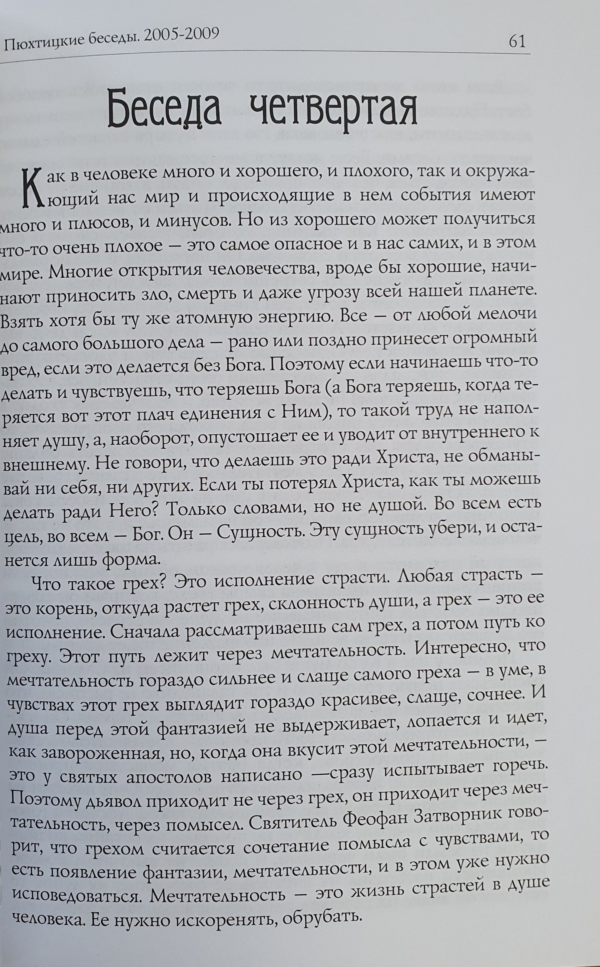 The Pyukhtitsa Monastery in Estonia is a special place of pilgrimage not only for Orthodox Christians from Russia and the Baltic States, but also from many other countries. People come here from all over the world, regardless of the visa regime and border formalities. They come alone and in groups, for a long time and for one or two days. Some come for excursions to get acquainted with the life of the monastery, some come for labor and prayer, and others send their footsteps to these lands in order to bear a difficult, but blessed monastic feat. The book Pyukhtitsa Conversations contains 16 conversations of Hieromonk Raphael (Demyanov) with the sisters and novices of the Pyukhtitsa Dormition Nunnery from 2005 to 2009.