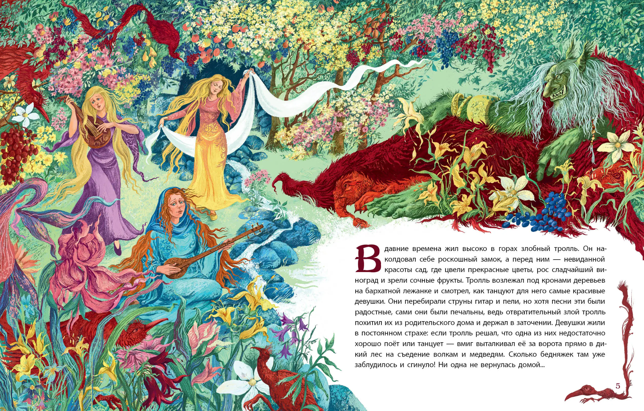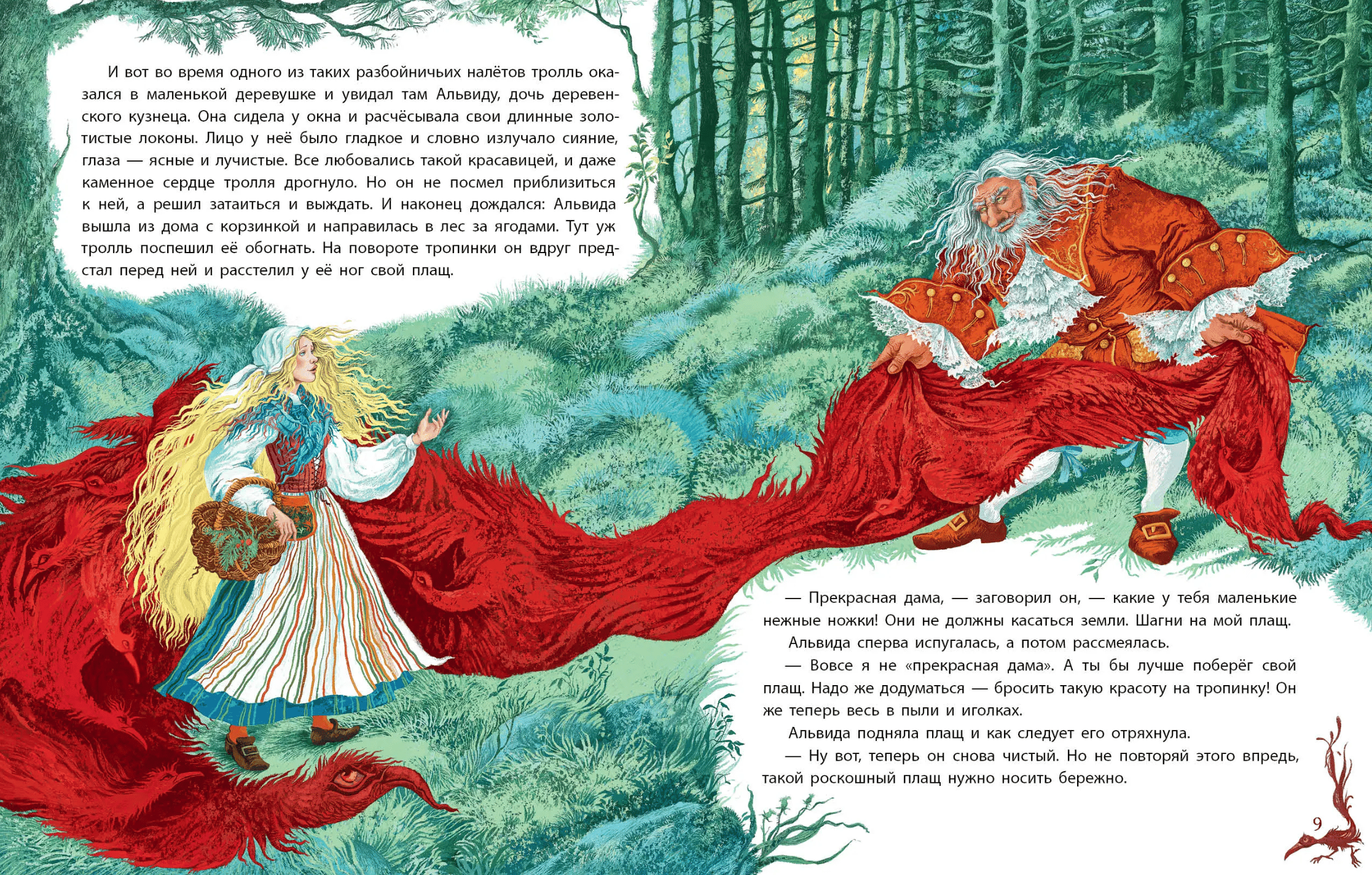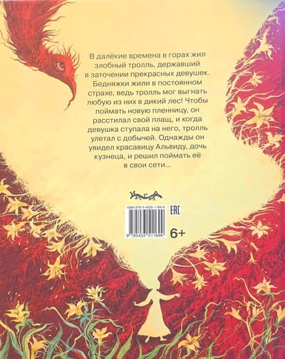 Long ago, a wicked troll lived in the mountains, holding beautiful maidens captive. The poor girls lived in constant fear, for the troll could drive any of them into the wild forest! To capture a new captive, he would spread his cloak, and when a girl stepped onto it, the troll would fly away with his prey. One day, he saw the beautiful Alvida, a blacksmith's daughter, and decided to catch her in his net...