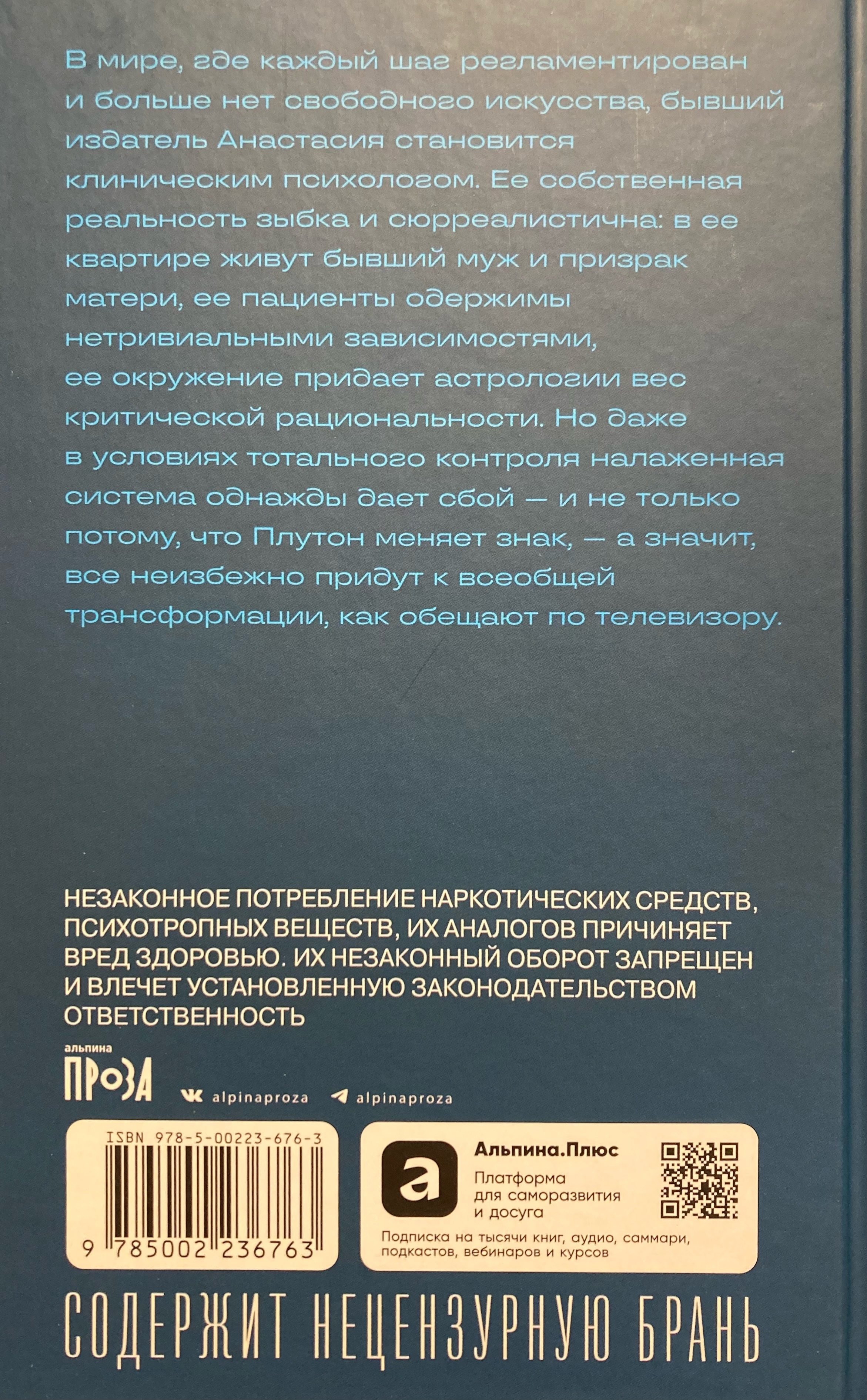 In a world where every step is regimented and free art no longer exists, former publisher Anastasia becomes a clinical psychologist. Her own reality is shaky and surreal: her ex-husband and her mother's ghost live in her apartment, her patients are obsessed with unconventional addictions, and her environment imbues astrology with the weight of critical rationality. But even under conditions of total control, the well-established system eventually malfunctions—and not only because Pluto is changing signs, meaning everyone will inevitably undergo a total transformation, as promised on television.