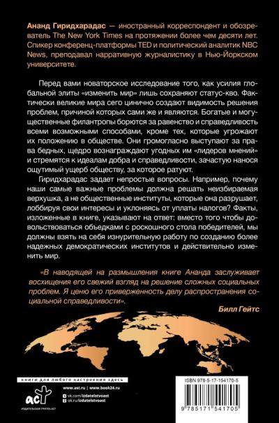 Before You is a groundbreaking exploration of how the efforts of the global elite to "change the world" only maintain the status quo. In fact, the world's greats cynically create the appearance of solving the problems they themselves cause. Rich and powerful philanthropists fight for equality and justice in every way possible, except those that threaten their position in society. They loudly advocate for the rights of the poor, lavishly reward their favorite "opinion leaders," and pursue ideals of goodness and justice, often to the tangible detriment of the society they champion. Giridharadas asks hard questions. For example, why should our most important problems be solved by the unelected top brass rather than the public institutions they destroy through lobbying and tax evasion? The facts in the book point to the answer: instead of settling for scraps from the lavish winners' table, we should take on the grueling work of building more robust democratic institutions and really change the world.