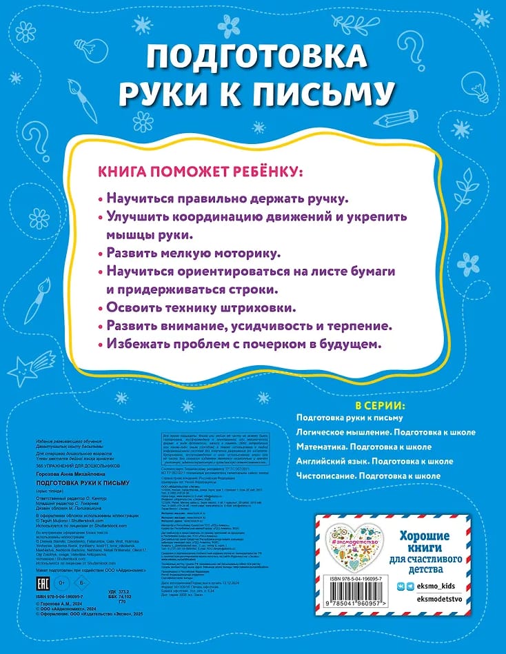 This book for children aged 3 and up will help a preschooler develop fine motor skills and prepare his hand for writing. In the future, this will help him avoid problems with penmanship and become the owner of beautiful handwriting. The workbook contains more than 365 exercises to prepare the hand for writing, designed for each day of the year. This contributes to the even distribution of the educational and play load and the formation of a positive attitude of the child to learning. The preschooler will practice tracing lines, drawings, letter elements, shading, finishing drawing details of images and drawing pictures according to a sample. He will learn to navigate on a sheet of paper, draw, adhering to the line, will become attentive, neat, independent and will acquire other important skills necessary for studying at school.