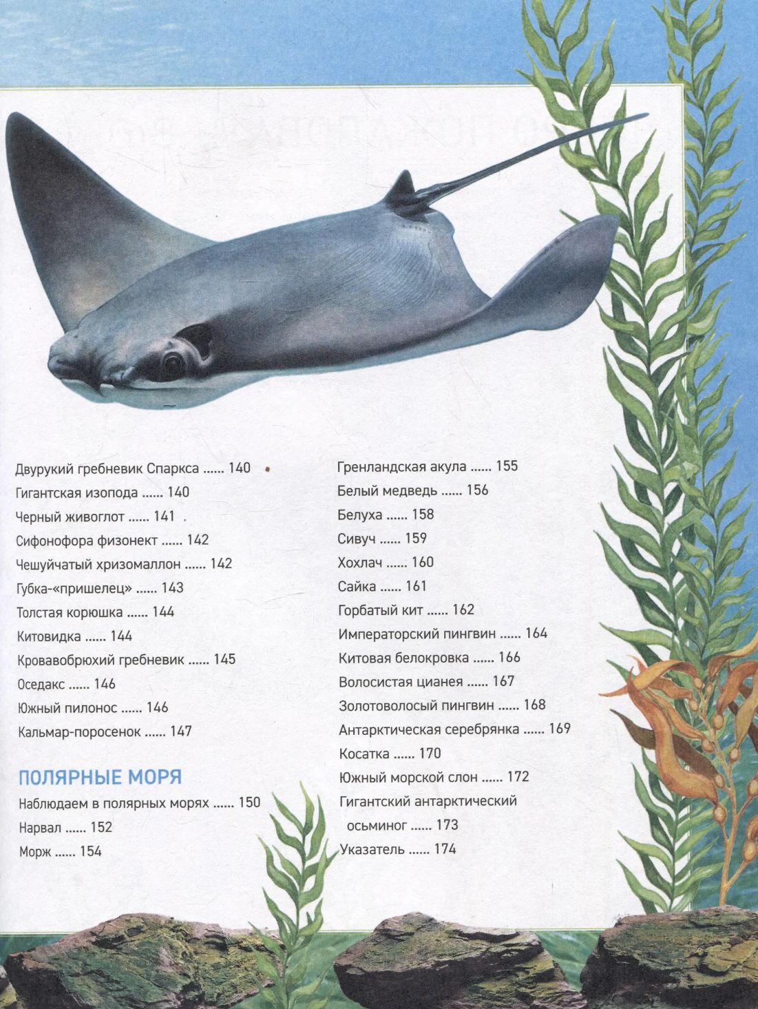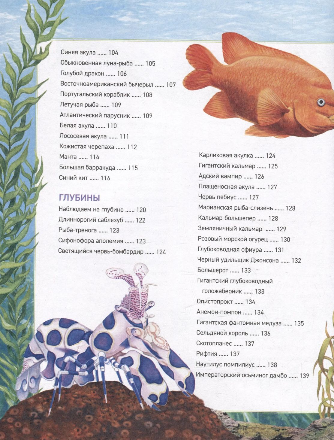 A large encyclopedia for primary and secondary school students about unusual inhabitants of the seas and oceans: sharks, dolphins, whales, killer whales, giant cuttlefish, sea snakes, hedgehogs, cucumbers and many others. Brief, concise information, large visual illustrations, color pages.