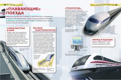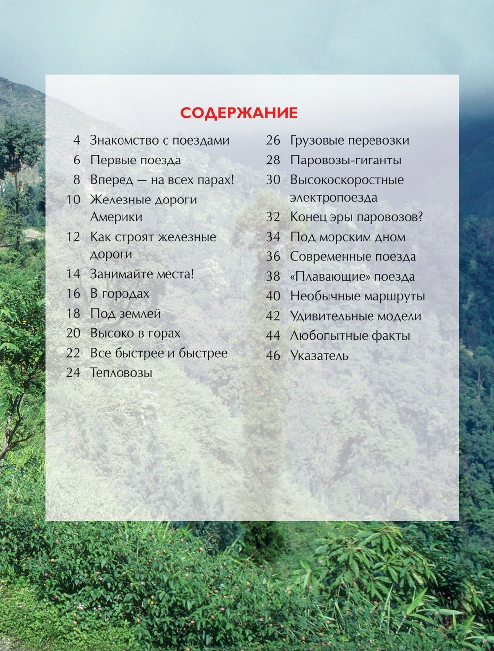 The book introduces the fascinating history of trains: from the very first steam locomotives to modern electric locomotives, explains the technical differences and features of their operation. The publication tells about how railways are built on the ground and underground, as well as under water. The book provides interesting facts about railway transport.