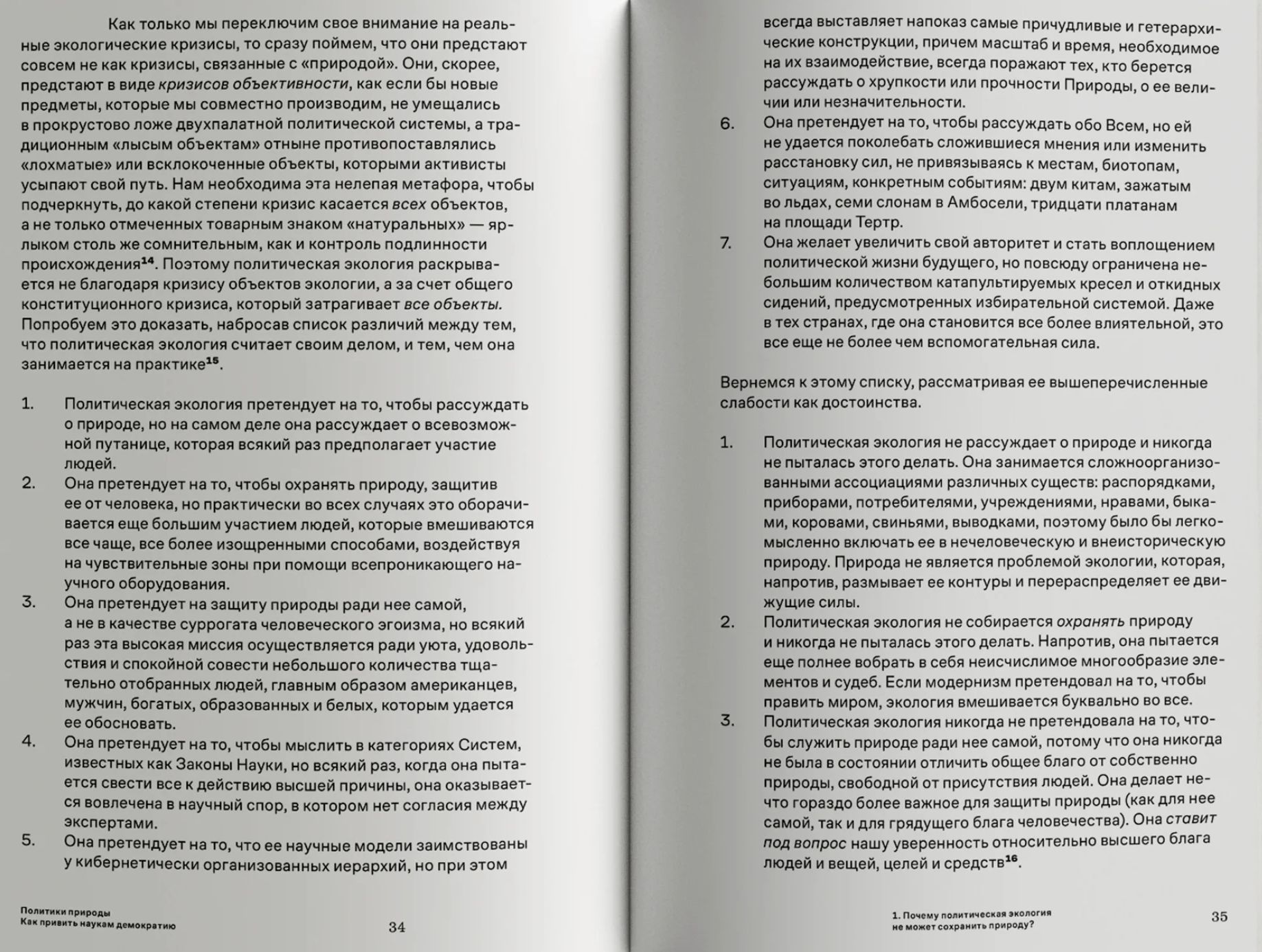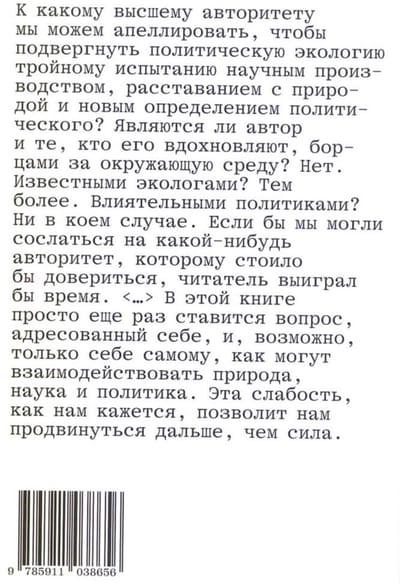 In his book, the French philosopher and sociologist Bruno Latour develops an original project of "experimental metaphysics." Its main goal is to develop a new concept of political ecology that would allow scientific practices to be combined with the democratic decision-making process, which requires a simultaneous revision of three fundamental concepts of Western philosophy: logos, physis, and polis. Drawing on developments in the sociology of science, comparative anthropology, political philosophy, as well as a fundamentally new understanding of the practice of environmental movements, Latour proposes a program for building a "common world" in which non-human actors participate on an equal footing with humans.