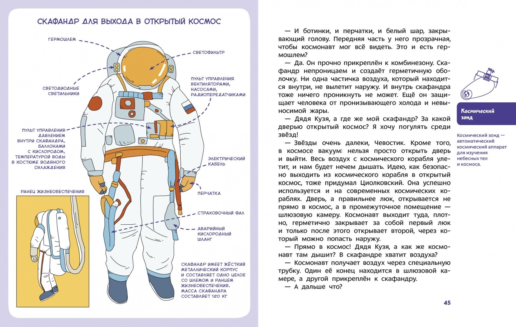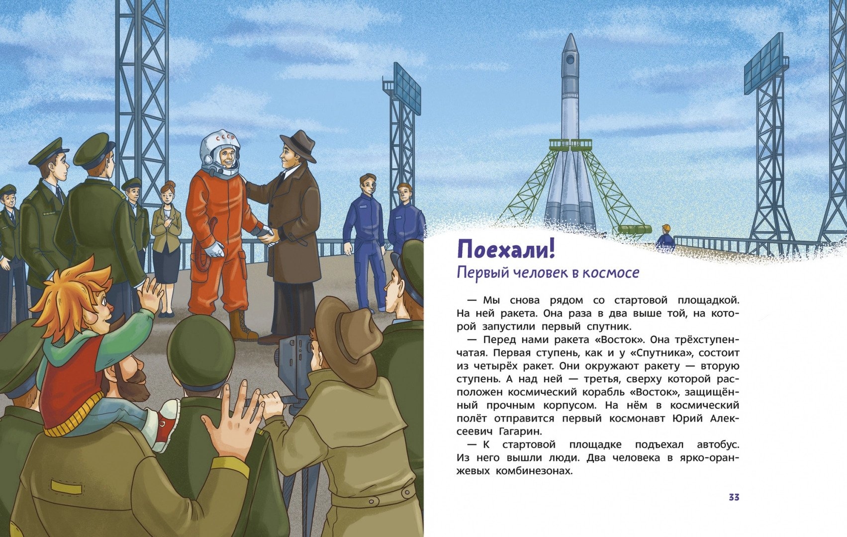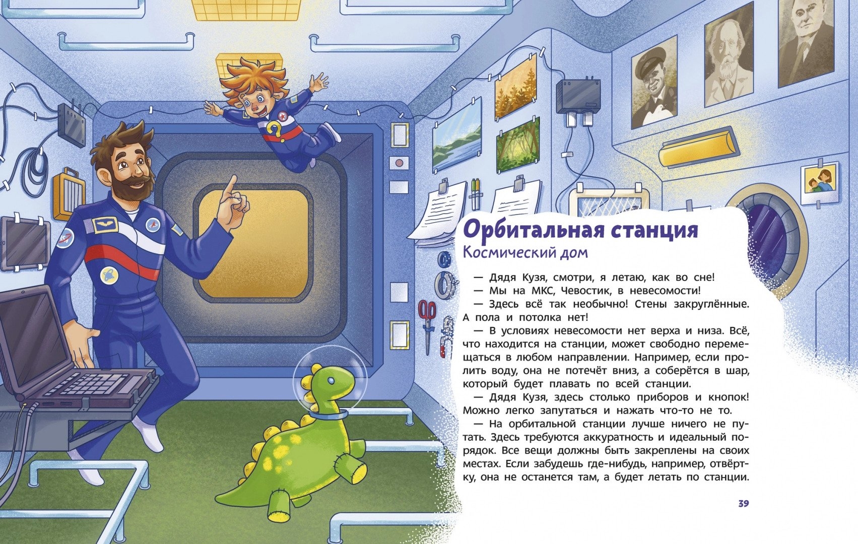 Chevostik and Uncle Kuzya are waiting for new incredible adventures. This time they will go into space. Heroes will study the history of astronautics, visit the International Space Station and see the landing of astronauts. And readers will watch the first human flight into space and find out whether it is possible to drink a cup of tea in weightlessness.