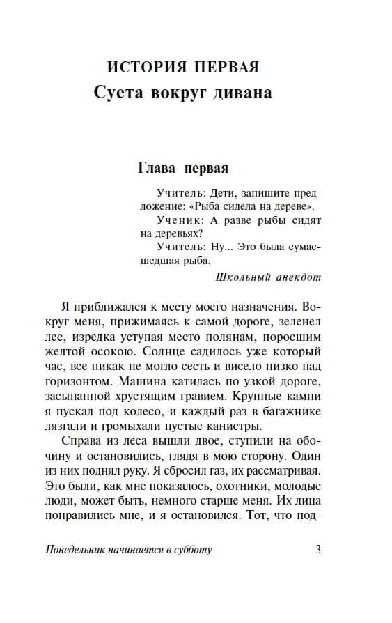 "Monday begins on Saturday. A fairy tale for young scientific workers" - under this title in 1965, the book was published, which was read and continues to be read by new and new generations. Its heroes, employees of the Research Institute of Witchcraft and Wizardry, are magicians and masters, young enthusiasts with a burning desire to know the world and transform it in the best possible way. Along the way they will have many amazing adventures and amazing discoveries. A time machine and a hut on chicken legs, the cultivation of artificial man and the subduing of the genie released from the bottle - the reader will not get bored!