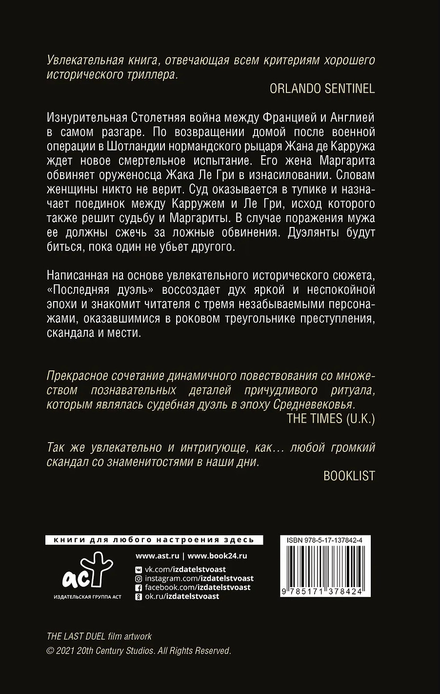 Based on a gripping historical plot, "The Last Duel" evokes the spirit of a vibrant and turbulent era and introduces readers to three unforgettable characters caught in a fatal triangle of crime, scandal, and revenge.