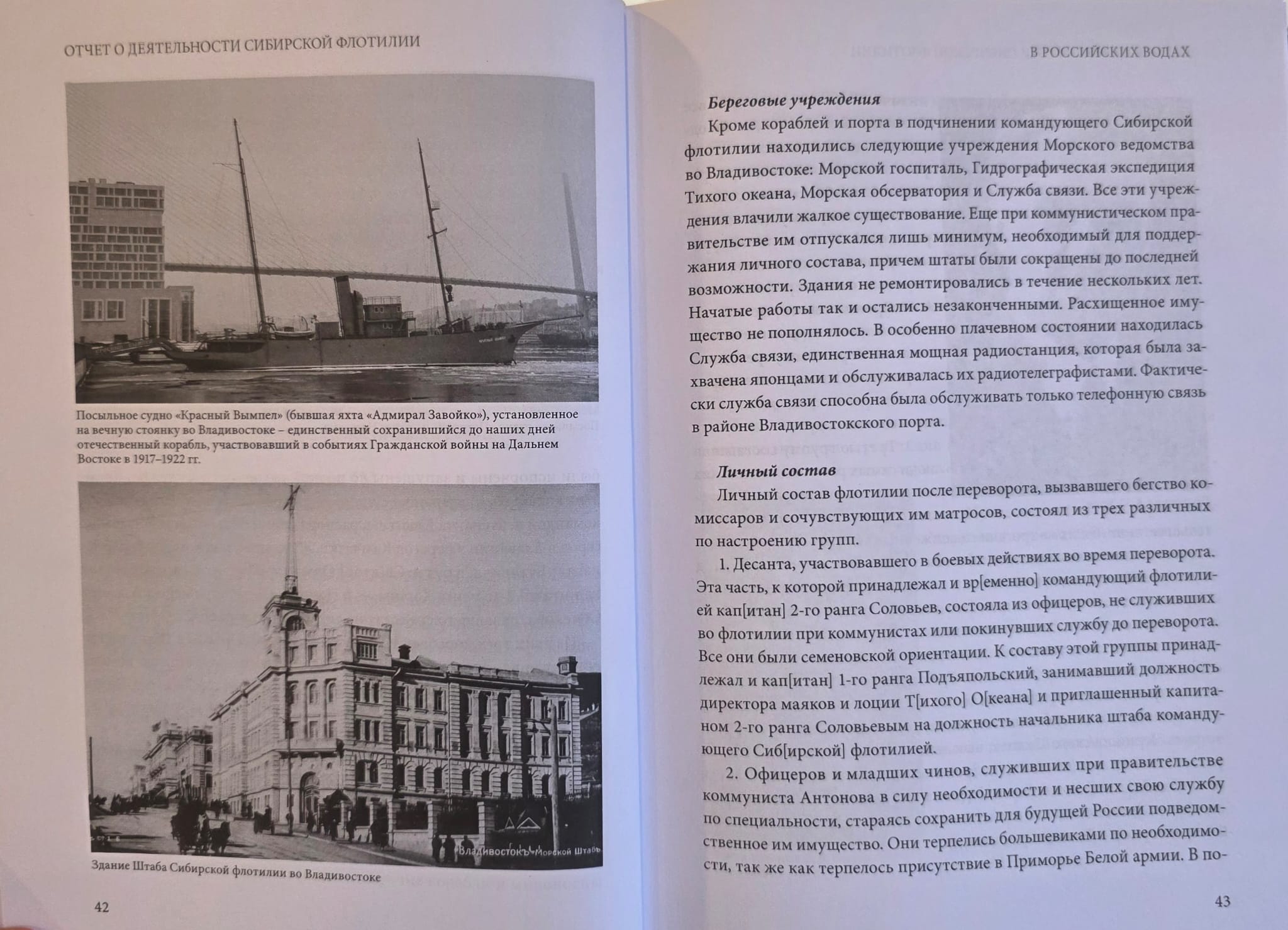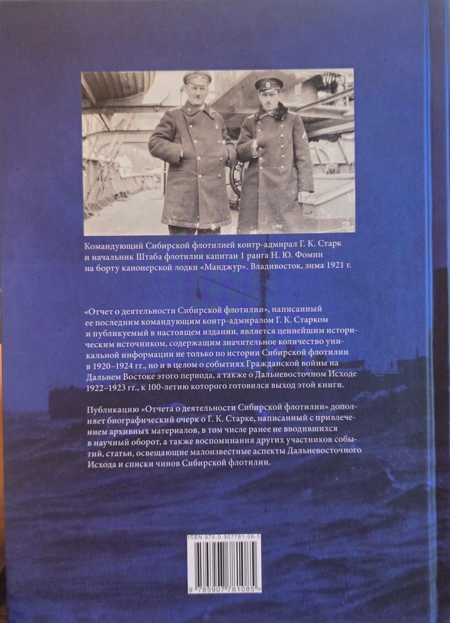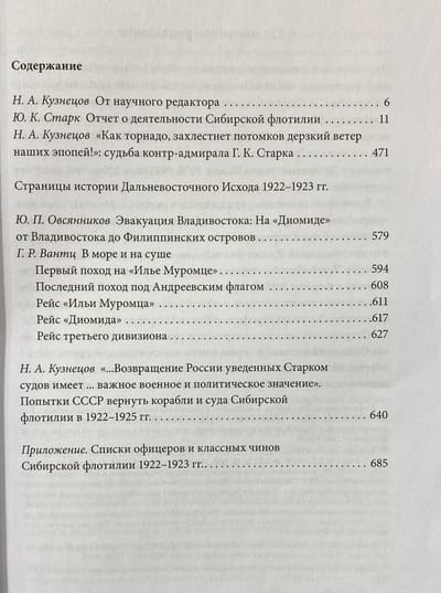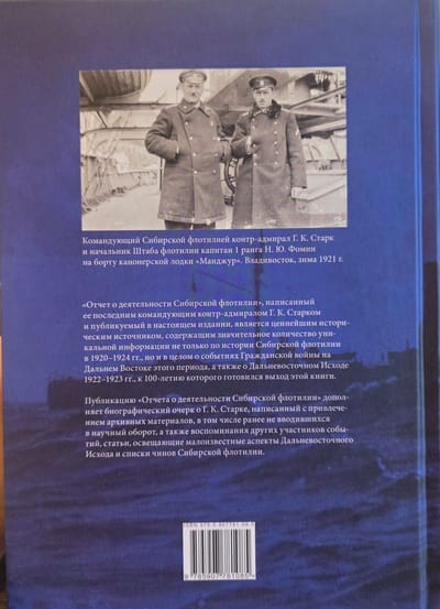 "The Report on the Activities of the Siberian Flotilla", written by its last commander, Rear Admiral G.K. Stark and published in this edition, is a valuable historical source containing a significant amount of unique information not only on the history of the Siberian Flotilla in 1920-1924, but also on the events of the Civil War in the Far East in this period in general, as well as on the Far Eastern Exodus of 1922-1923, for the 100th anniversary of which this book was being prepared. The publication of the "Report on the Activities of the Siberian Flotilla" is supplemented by a biographical essay on G.K. Stark, written using archival materials, including those previously not introduced into scientific circulation, as well as memoirs of other participants in the events, articles covering little-known aspects of the Far Eastern Exodus and lists of ranks of the Siberian Flotilla.