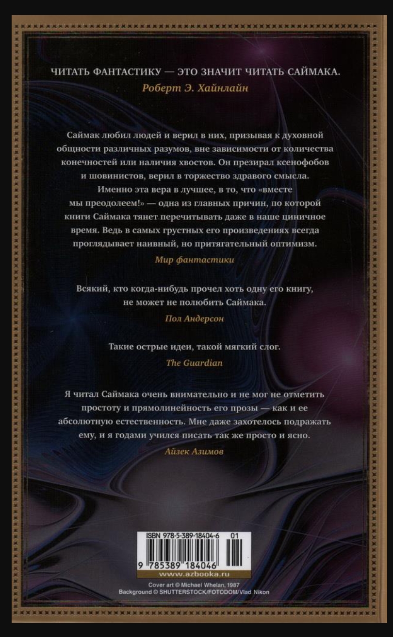 Clifford Simak is one of the founding fathers of modern science fiction, a giant of a writer who gave birth to the term "golden age of sci-fi" in American literature. Early in his literary career, Simak wrote hard science fiction and adventure stories, as well as Westerns, but he later expanded the boundaries of the sci-fi genre and created his own style, which critics called soft, humanistic, and even pastoral, comparing Simak's prose to that of Ray Bradbury. Over fifty-five years, Simak wrote approximately thirty novels and over one hundred and twenty short stories. He was awarded the Hugo, Nebula, Locus, and other awards, and was named a Nebula Grandmaster.