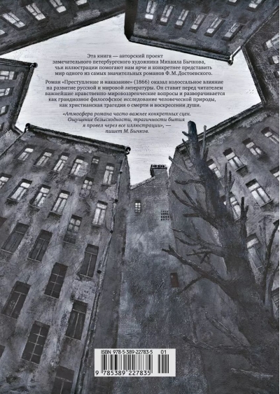 This book is an author's project by the remarkable St. Petersburg artist Mikhail Bychkov, whose illustrations help us to visualize more vividly and concretely the world of one of the most significant novels by F. M. Dostoevsky. The novel "Crime and Punishment" (1866) had a tremendous impact on the development of Russian and world literature. It was conceived as a "psychological account of a single crime," but the writer far departed from the original plans. "Crime and Punishment" puts before the reader the most important moral and attitudinal questions about faith, conscience, sin and redemption through suffering and unfolds as a grand philosophical study of human nature, as a Christian tragedy about the death and resurrection of the soul. "The atmosphere of a novel is often more important than the specific scenes. The feeling of hopelessness, tragedy of existence I carried through all the illustrations", - writes M. Bychkov.