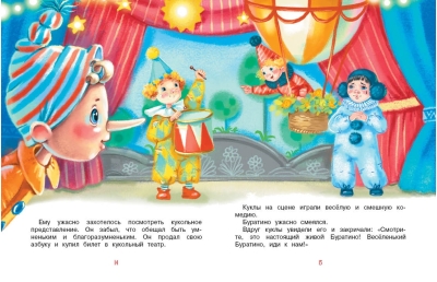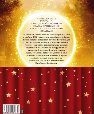 This famous tale by Alexei Tolstoy was published back in 1936 and was immediately loved by children. Later, Tolstoy retold the story of Buratino for very young readers, so that those just beginning to read could also get to know the cheerful wooden boy and his friends—the beautiful Malvina, the dreamy Pierrot, and the brave Artemon—and join them in solving the mystery of the golden key, opening their own theater, and having a hearty laugh at the evil and hapless Karabas-Barabas.