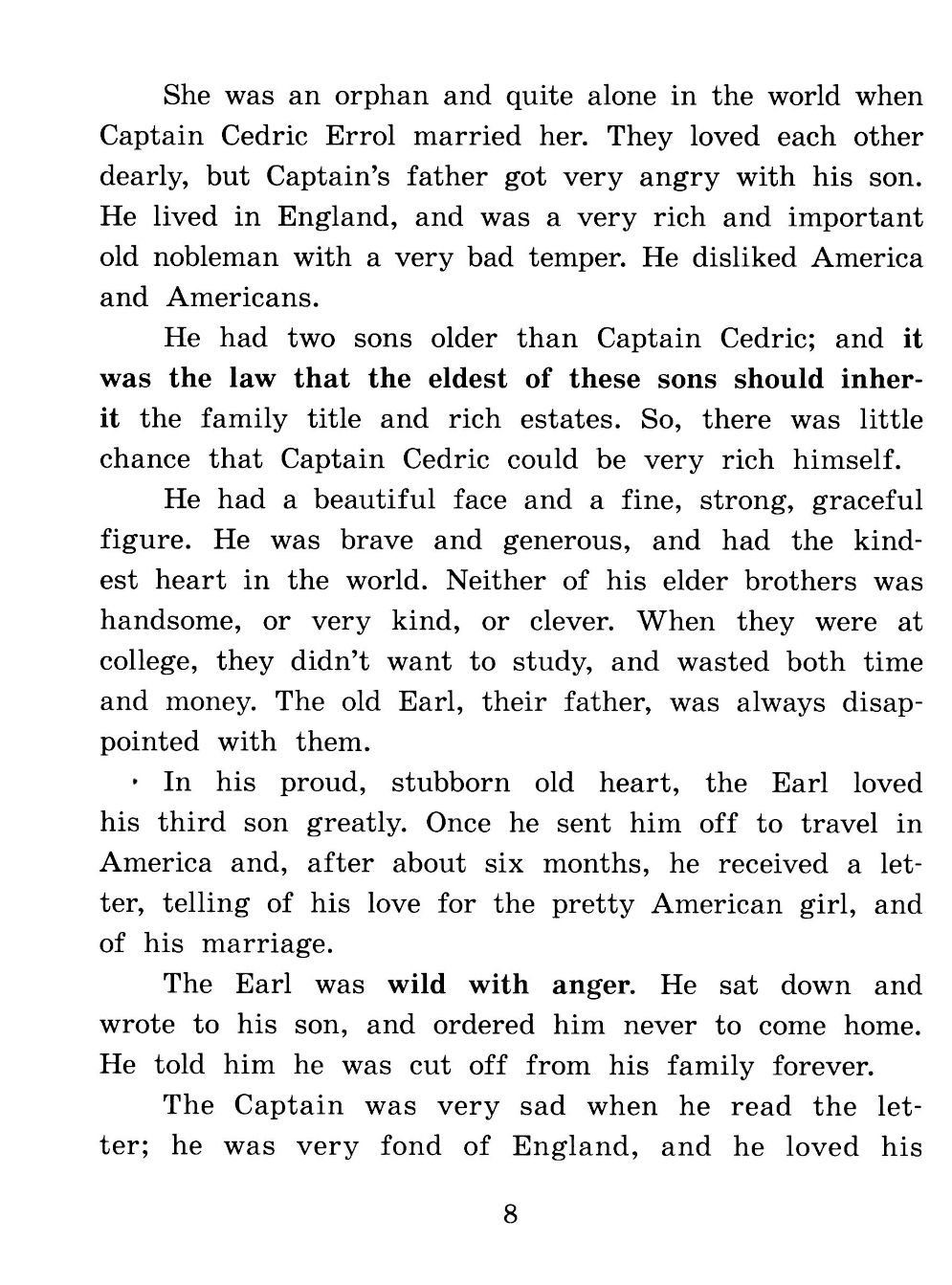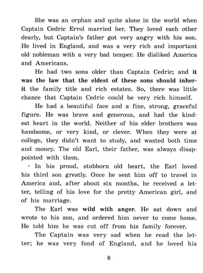 This is the amazing story of a little boy named Cedric, who, by a twist of fate, becomes the sole heir of a wealthy English lord. After living with his mother in America for the first seven years of his life, he moved in with his grandfather and found himself immersed in the world of the prim English aristocracy. With his simplicity, common sense, and genuine kindness, Cedric managed to warm the heart of his stern grandfather and improve his life.