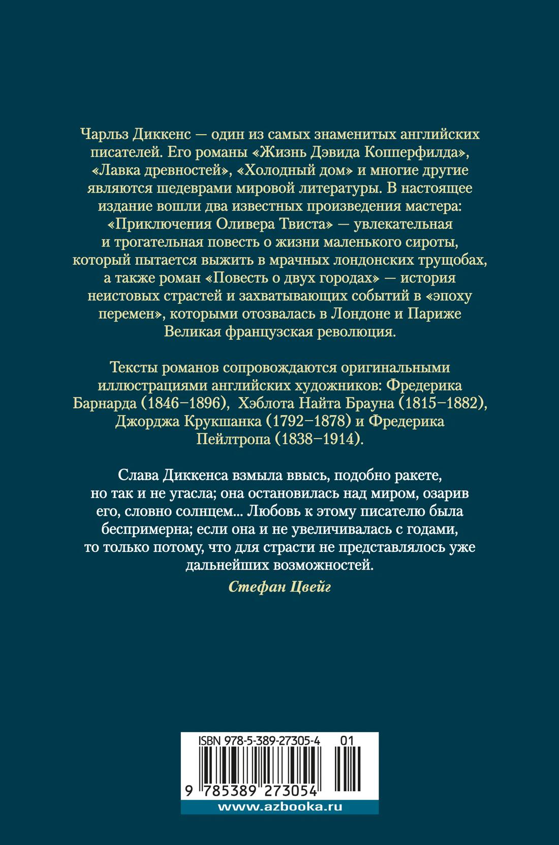 Charles Dickens is one of the most famous English writers. His novels "The Life of David Copperfield", "The Old Curiosity Shop", "Bleak House" and many others are masterpieces of world literature. This edition includes two famous works of the master: "The Adventures of Oliver Twist" - a fascinating and touching story about the life of a little orphan who tries to survive in the gloomy London slums, as well as the novel "A Tale of Two Cities" - a story of violent passions and exciting events in the "era of change" that the Great French Revolution echoed in London and Paris. The texts of the novels are accompanied by original illustrations by English artists: Frederick Barnard (1846–1896), Hablot Knight Brown (1815–1882), George Cruikshank (1792–1878) and Frederick Pailthrop (1838–1914).