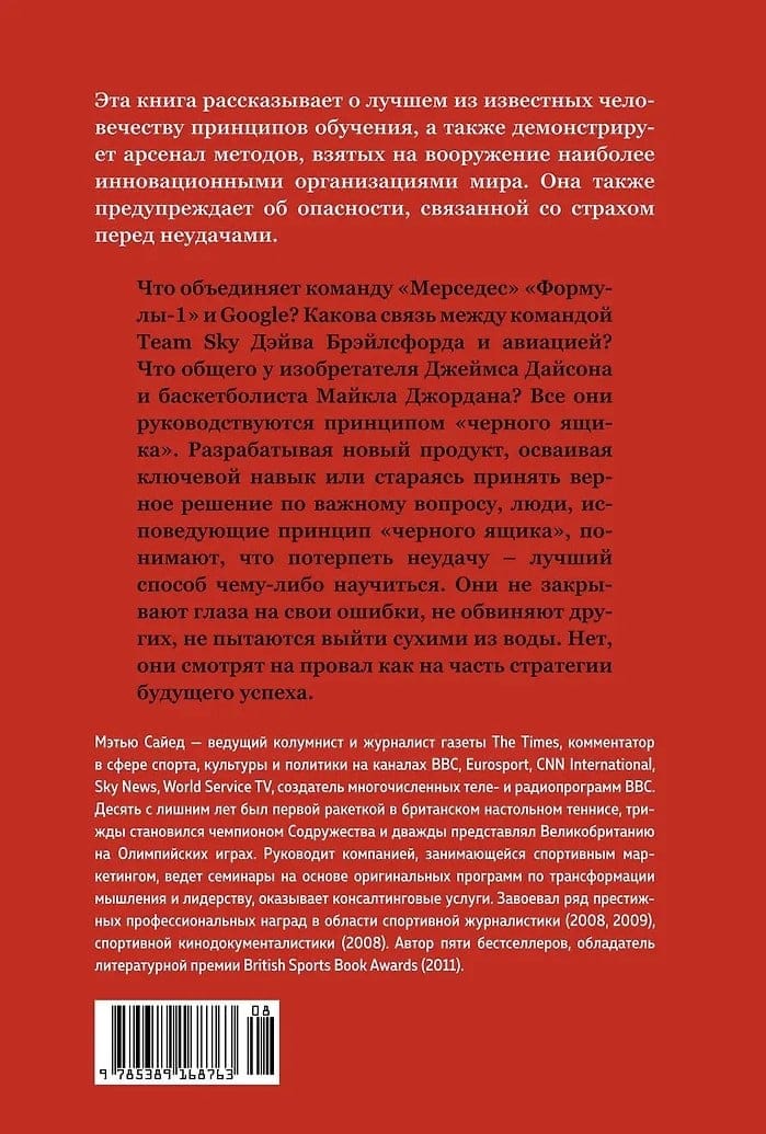 In modern culture, it's common to celebrate achievements and ignore failures. Mistakes are either perceived as unfortunate circumstances and random deviations from the norm, or, conversely, they are overestimated—in which case the person who made the wrong decision is accused of incompetence and stigmatized. Matthew Syed, a British journalist and businessman, former tennis great, and multiple Olympian, draws on his extensive experience in sports, entrepreneurship, and creativity to conclude that this attitude toward mistakes deprives people and organizations of the opportunity to learn from failures and address their root causes. Syed explores the origins and consequences of mistakes in science, engineering, law, and sports, uncovering the psychological mechanisms behind the desire to hide failures, and demonstrating the path everyone must take to change their attitude toward mistakes and use them as the foundation for future success. "By telling success stories, we will seek to uncover all its components. We will uncover and explore the secret processes that enable us to learn, change, and create—in business, in politics, and in everyday life. As we will see, in all cases, success is invariably explained—unexpectedly and often counterintuitively—by how we respond to failure." (Matthew Syed)