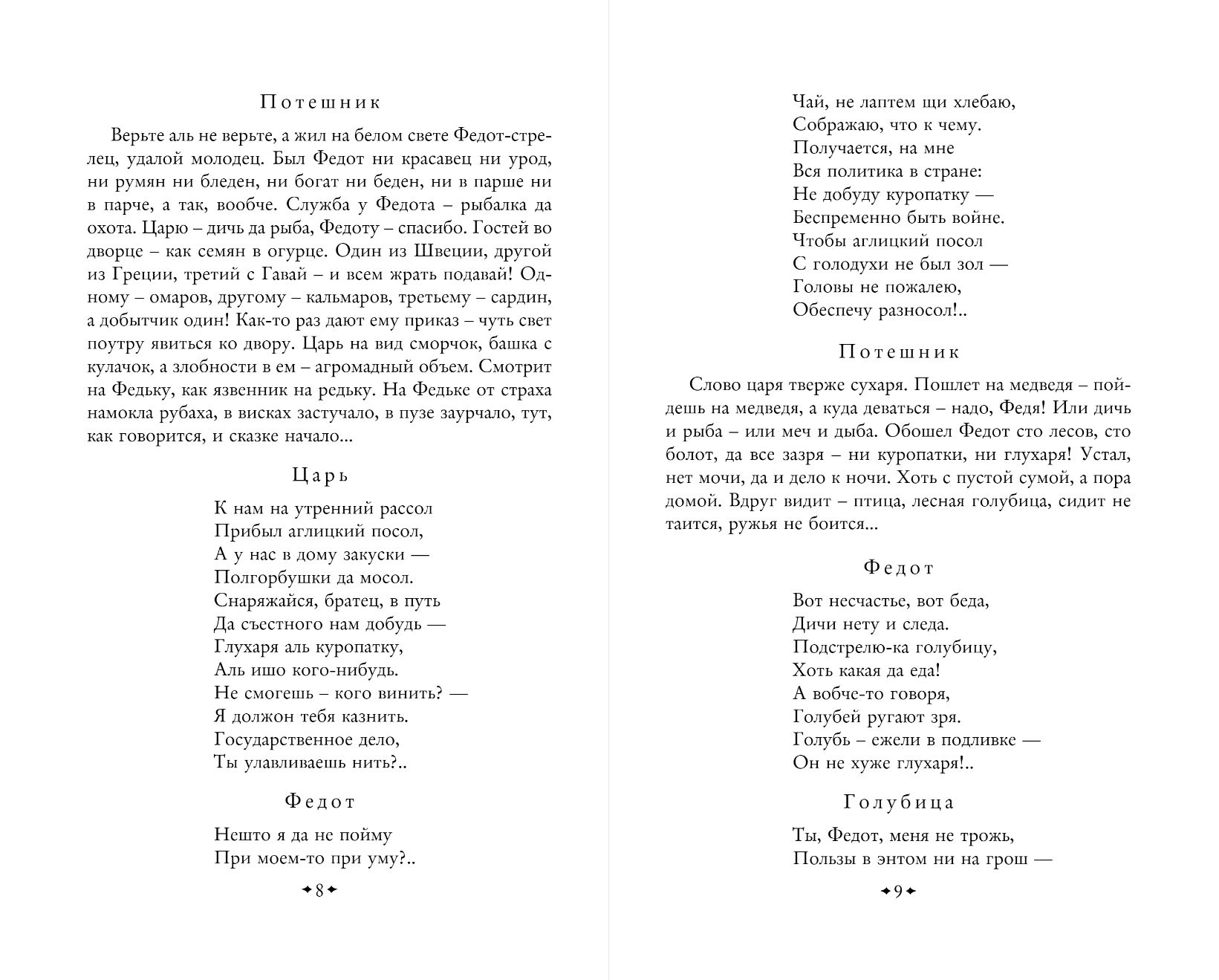 His witty play "About Fedot the Archer, a Daring Fellow," based on a Russian fairy tale, gained immense popularity. Fedot is the embodiment of folk wisdom, who in his adventures encounters the whims and tyranny of the Tsar, but invariably finds a way out thanks to his ingenuity and faith in justice. A television version was shown on Soviet television in 1991.