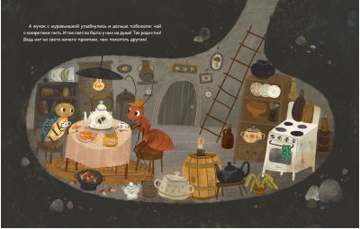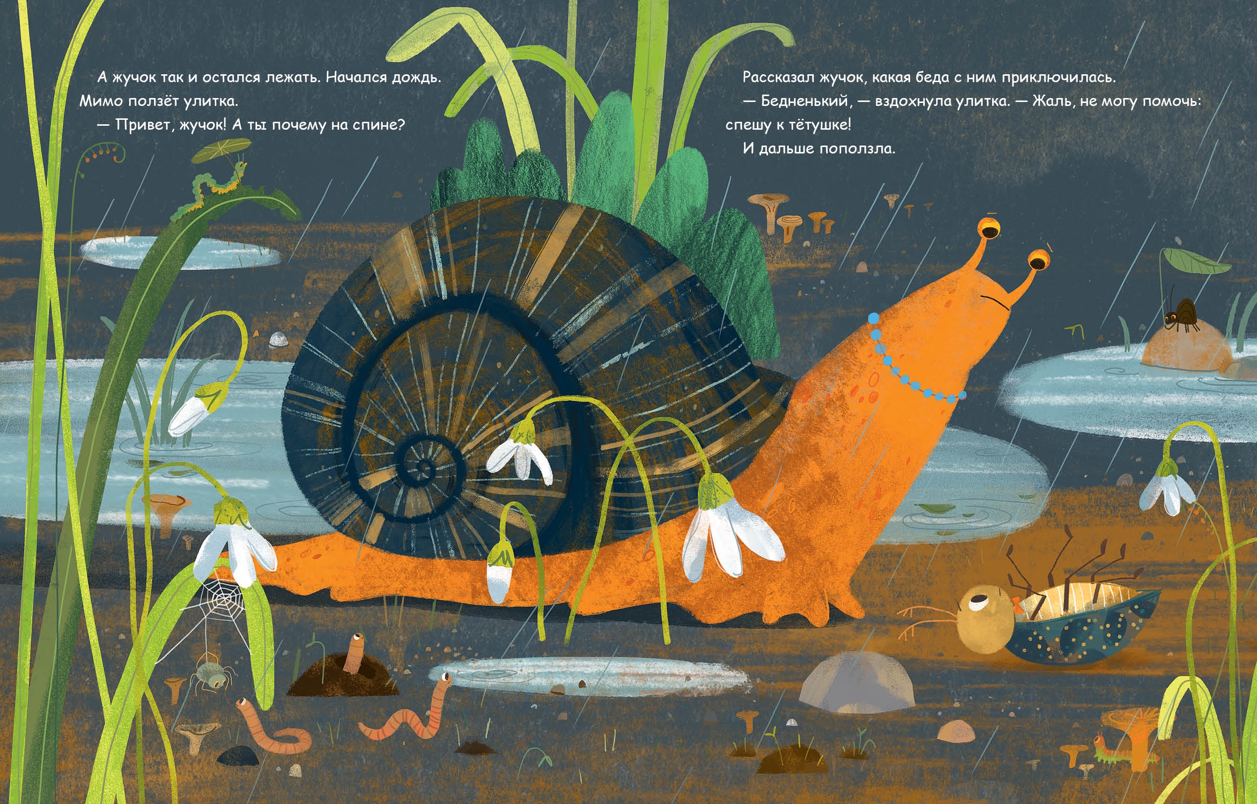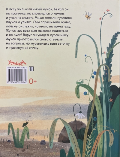In the forest lived a little beetle. He was running along a path when he tripped over a stone and fell backwards. A caterpillar, a spider, and a snail crawled past. They asked the beetle why he was lying there, but no one helped him. The beetle struggled to get up and couldn't! Suddenly, he saw an ant. The beetle prepared to answer questions again, but the ant took a twig and handed it to the beetle...