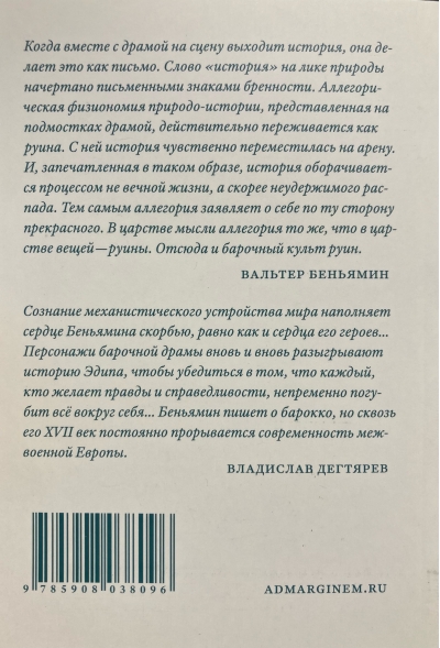 Walter Benjamin's "The Origin of German Baroque Drama" (1928) is the author's dissertation, rejected by the scholarly community at the time, and yet one of the most important aesthetic-philosophical works of the past century. It fully reveals Benjamin's creative characteristic, which Hannah Arendt called "poetic thinking." The range of phenomena examined by Benjamin is far broader than the title suggests. He is concerned not with the letter of seventeenth-century German drama, but with its spirit. In the German philosopher's analysis, the baroque suddenly emerges not as "relevant" as a mirror of modernity, but as one possible answer—an unusually sober and profound one at that—to the questions that confronted those who lived through and continue to live through the tragic events of the twentieth century.