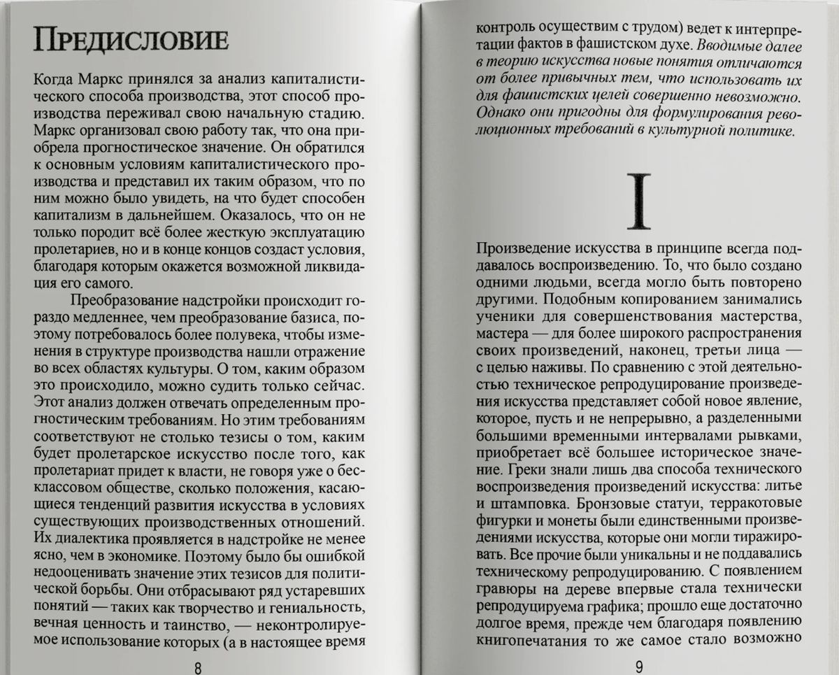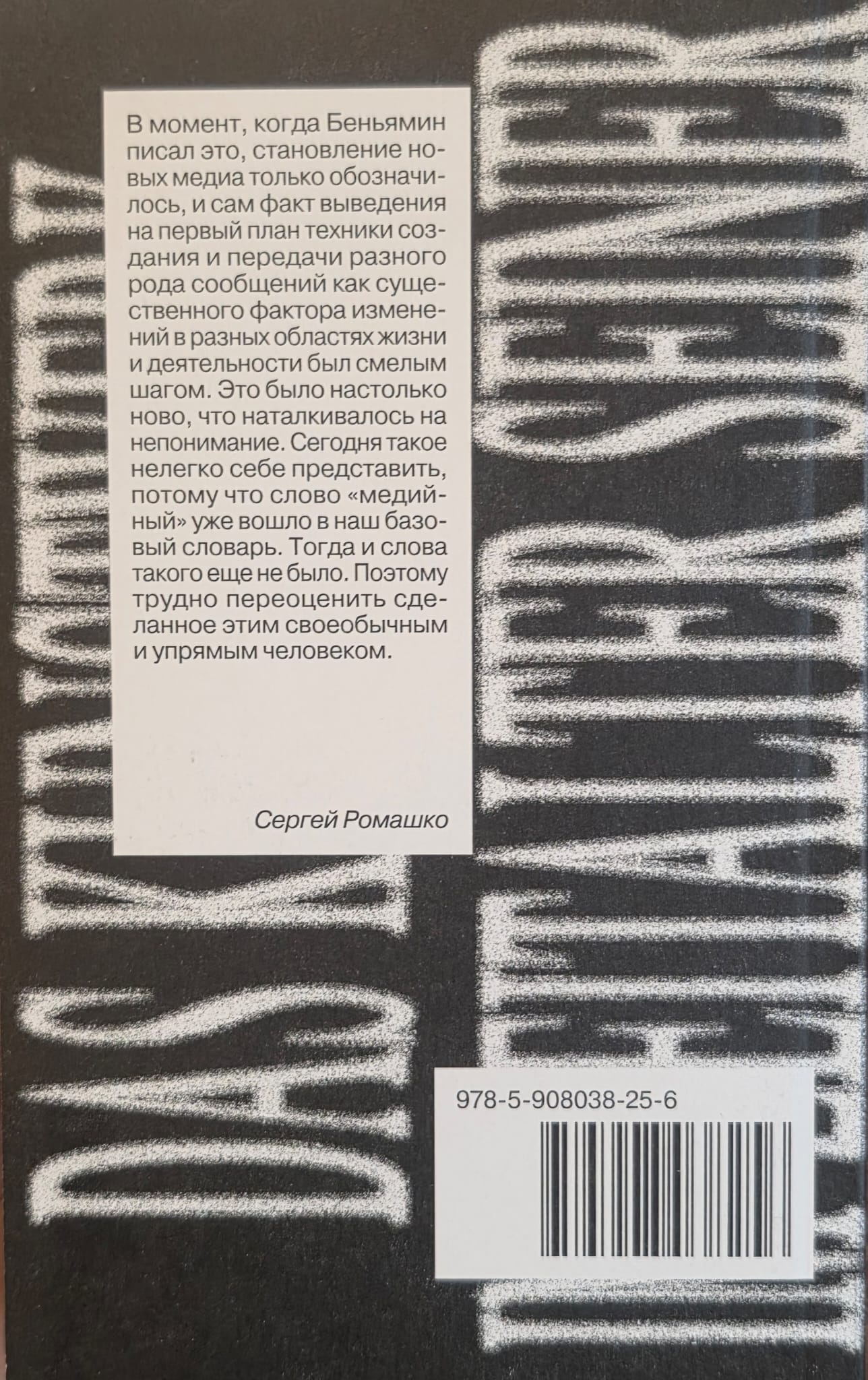 Walter Benjamin's most famous essay explores the transformation of artistic perception in the face of technological innovations in the creative process, analyzing how new media have altered the understanding of the uniqueness and authenticity of a work of art becoming an object of mass consumption. Sergei Romashko, author of the classic translation of "The Work of Art," wrote a detailed article especially for this edition, accompanied by a selection of Benjamin's texts illustrating the author's intellectual journey toward this work. Some of these texts are being published in Russian for the first time ("Medium...," "Newspaper," "Reflections on Radio," "Response to Oskar Schmitz's Article," and "About Mickey Mouse").