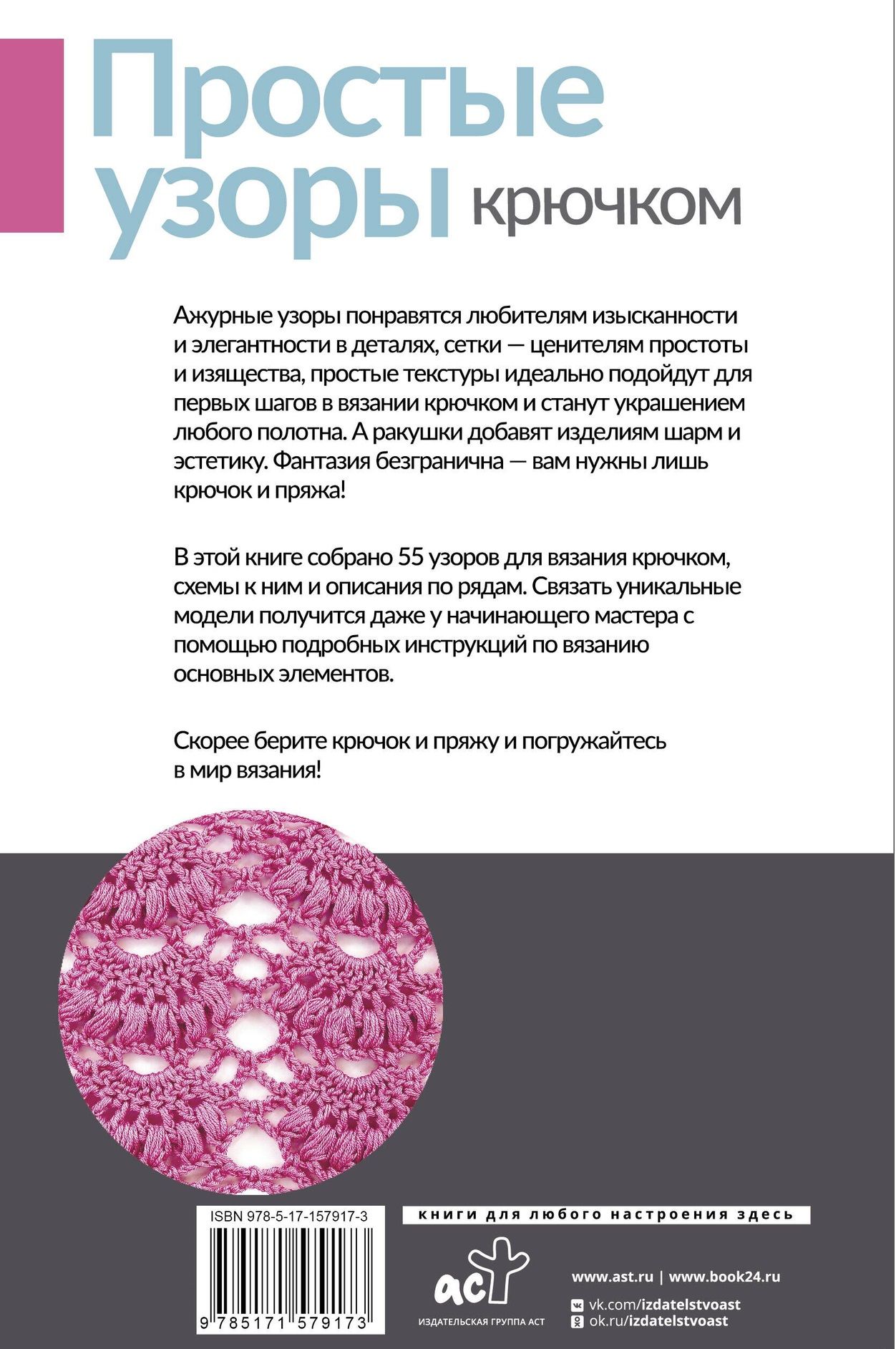 This book contains 55 crochet patterns, diagrams for them and descriptions by rows. Even a novice master will be able to knit unique models with the help of detailed instructions for knitting the main elements.