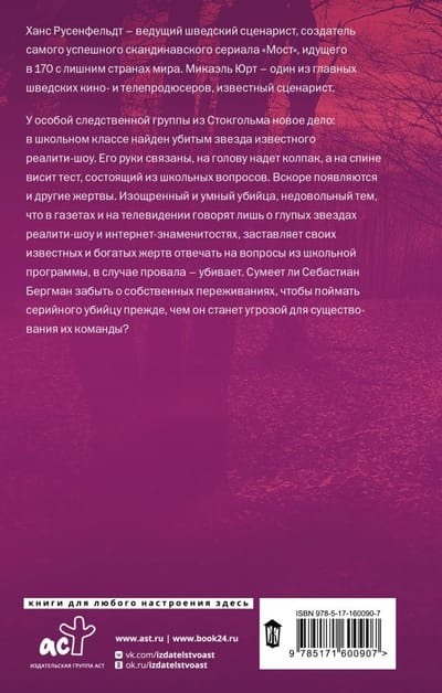 A special investigation team from Stockholm has a new case: a famous reality TV star is found murdered in a school classroom. His hands are tied, a cap is on his head and a test consisting of school questions is hanging on his back. Soon other victims appear. A sophisticated and clever killer, dissatisfied with the fact that the newspapers and television talk only about stupid reality stars and Internet celebrities, forces his famous and rich victims to answer questions from the school curriculum, in case of failure - kills. Will Sebastian Bergman be able to forget his own worries to catch a serial killer before he becomes a threat to their team's existence?