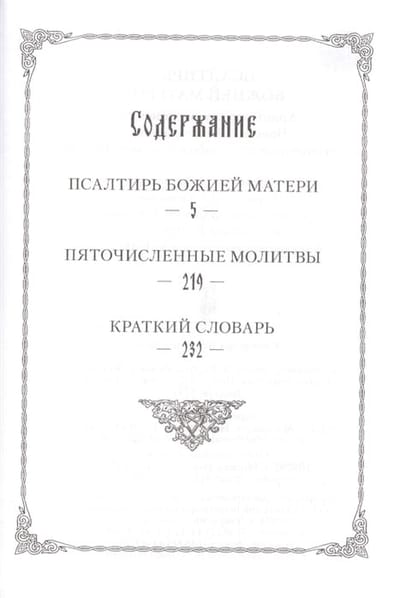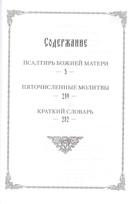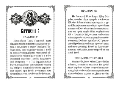 Orthodox people have long honored the Blessed Virgin Mary. They express their gratitude and love to the Mother of the Savior of mankind in prayers, akathistas, and prayer chants. The reverent love of the people moved St. Demetrius of Rostov (it is to him that the authorship of "folk hymnography" is unanimously attributed) to create a collection entirely devoted to praise in honor of the Intercessor of our Zealous Mother. For this prayer book the saint took as a prototype the Psalter of King David, which is why we traditionally call the prayers collected here hymns. Offered for home praise, of which Christian humility does not leave the spiritual father unaware, these psalms are capable of becoming a source of fervent penitential tears and, at the same time, of deep consolation, given as a pledge of the special intercession of Our Most Holy Mother the Theotokos. Accept, O All-Blessed and All-Powerful, Most Pure Lady, Our Lady, the Theotokos, these prayers, which we, Thy unworthy servants, offer to Thee now with tears, to Thy all-pervading image, as Thou Thyself Who art there, hearing our prayers, and granting with faith to those who ask, according to each one's petition, the fulfillment thereof. Contents: Psalter of the Mother of God Five Prayers A Brief Dictionary