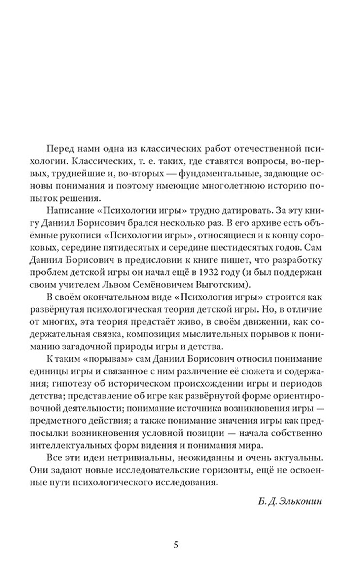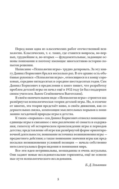 Why are games so important for the development of a child's personality? What came first — play or work? How do individual developmental characteristics of children affect play activities and what role do Russian and foreign psychologists assign to it? The book by the outstanding Russian psychologist Daniil Elkonin is based on the theoretical and experimental studies of A. Leontiev, L. Zaporozhets and P. Galperin. He presents the theory of children's play in line with the cultural and historical concept of Lev Vygotsky, where the main motivation of a child is to imitate adults and assume their role. The author identifies and analyzes 4 periods of development of play activities of a preschooler, each of which is accompanied by the results of practical observations. The book is recommended for students, graduate students and specialists in the field of psychology, as well as educators and parents of preschool children.