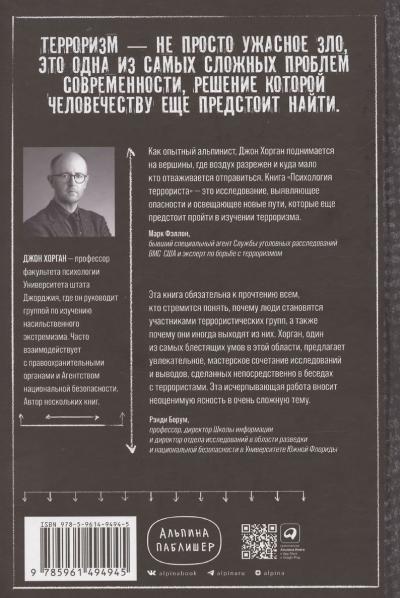 Terrorism is not just a terrible evil, it is one of the most complex problems of our time, the solution to which humanity has yet to find. John Horgan, a recognized expert in the psychology of terrorism, describes in his book the mechanisms that lead ordinary people to the path of violent extremism. Their actions are often dictated by a destructive ideology that justifies the use of violence for greater ends, but the motivation of terrorists may seem rational only to themselves. The author draws on twenty years of research experience and offers readers a unique analysis of the way of thinking, behavior and ideology of participants of various terrorist organizations. He dispels myths about terrorism, analyzes the role of high technology in shaping the image of terror in the twenty-first century, and proposes measures that can help deradicalize and rehabilitate members of extremist groups.