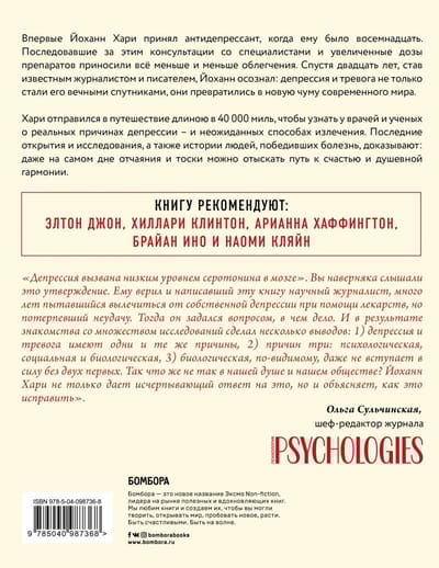 This book is both a personal odyssey of the author, renowned journalist Johann Hari, and a fascinating investigation. He embarked on a 40,000-mile journey to learn about the real causes of depression and truly effective cures. The result was numerous interviews with scientists and medical professionals who deal with depression and stories of patients who have conquered the disease. The book covers 9 scientifically proven causes of depression and provides solutions that offer hope for healing to a huge number of people.