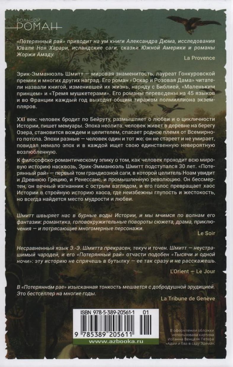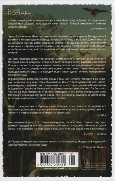 Eric-Emmanuel Schmitt spent 30 years preparing his philosophical and romantic epic about how a man navigates the entire course of world history. And finally, Paradise Lost—the first volume of a grand saga in which the immortal healer Noam will experience the Babylonian Empire, Ancient Greece, the Renaissance, and the Industrial Revolution. Immortality transforms man into an eternal exile and endows him with a keen perspective: Noam sees things from a unique perspective, and his voice transforms the chaos of History into a coherent story of chaos, where stupidity and cruelty are inevitable, but wisdom and love always find a place.