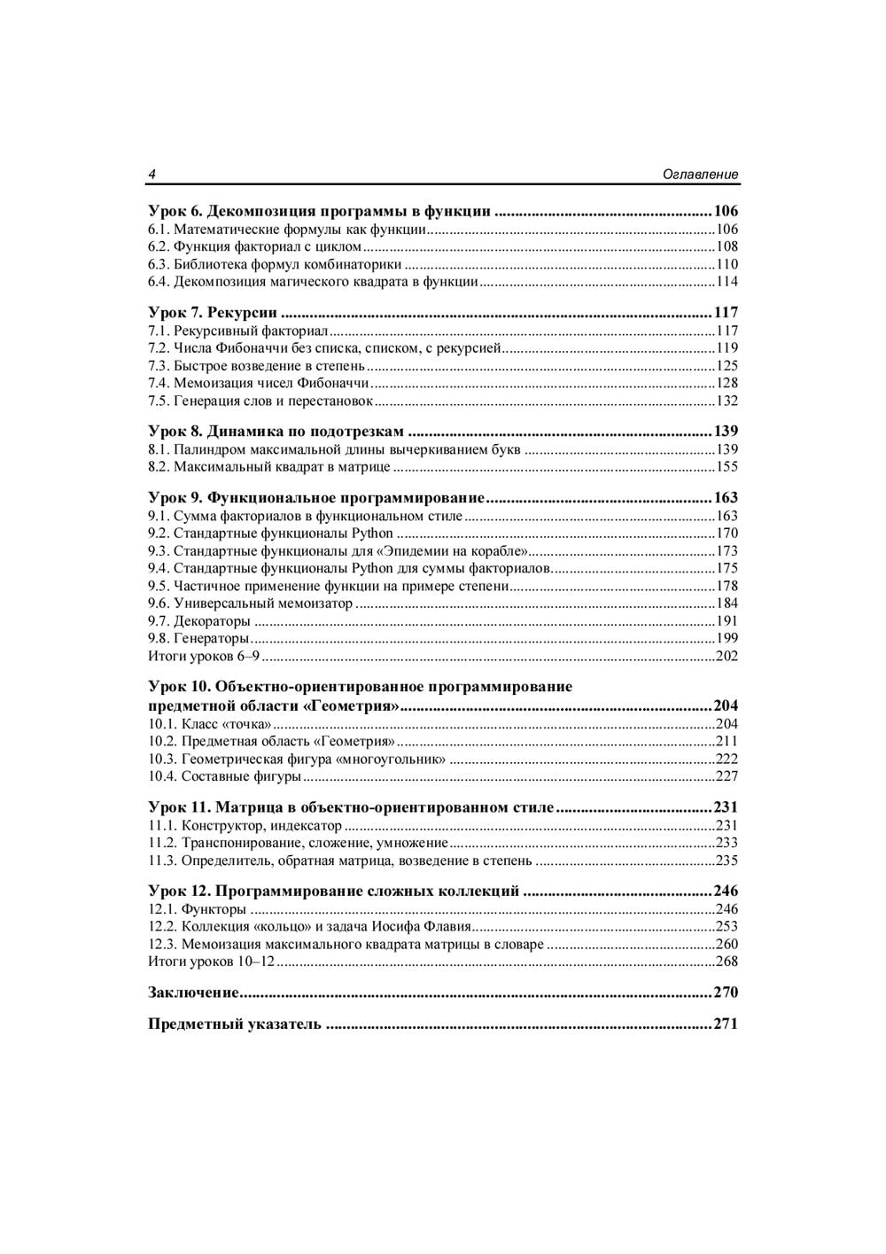 The 12 lessons show the basics of programming and the basic constructs of the Python language. The principles of different programming styles are explained. The concepts of input/output, variables, conditions, number flow, loops and lists, arrays, functions and recursion are given. Features of structural, object-oriented and functional programming are considered. Each chapter offers practical tasks and gives their step-by-step solution with a detailed description of the algorithm. For beginning programmers.