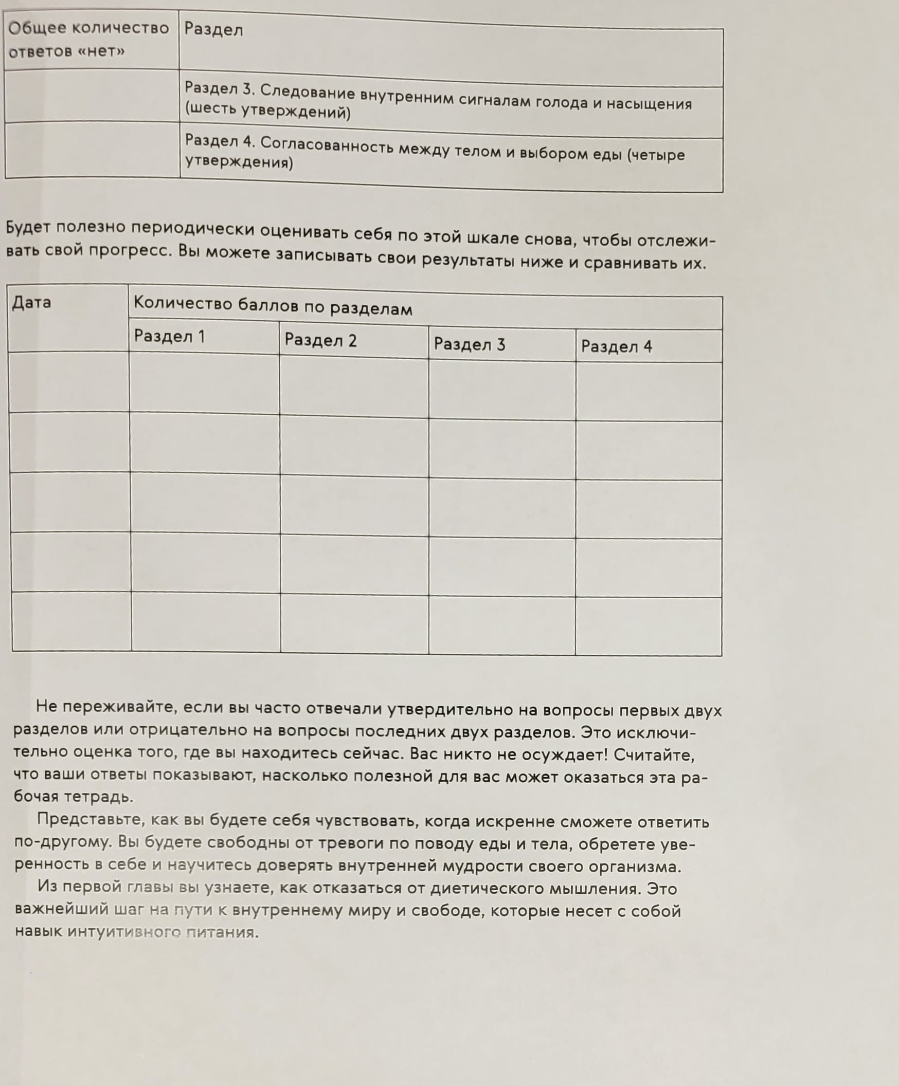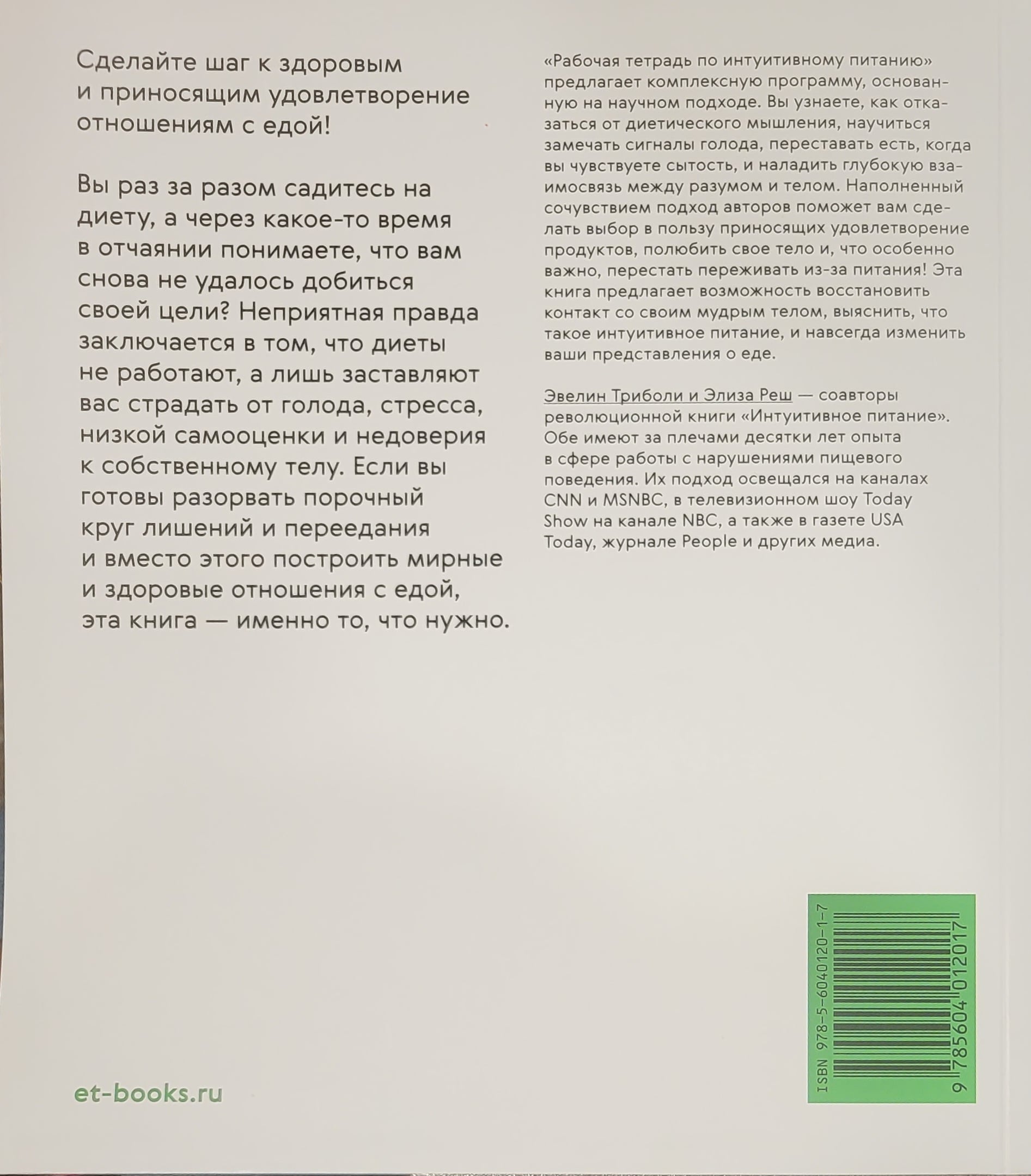 The Intuitive Eating Workbook offers a comprehensive program based on science. You will learn how to let go of diet thinking, learn to recognize hunger cues, stop eating when you feel full, and establish a deep connection between your mind and body. The authors' compassionate approach will help you make satisfying food choices, love your body, and most importantly, stop stressing about food! This book offers the opportunity to reconnect with your wise body, discover what intuitive eating is, and change the way you think about food forever. This book provides complete, accurate, and authoritative information on the topic covered. The publisher does not provide psychological, financial, legal, or other consulting services. If you need help from specialists or consultants, seek help from competent professionals.