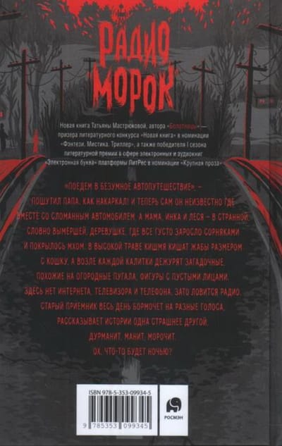 "Let's go on a crazy road trip," Dad joked. How he'd jinxed it! And now he's lost somewhere with his broken car, while Mom, Inka, and Lesya are in a strange, seemingly deserted village, where everything is thickly overgrown with weeds and covered in moss. The tall grass is teeming with toads the size of cats, and mysterious figures with blank faces, like scarecrows, keep watch at every gate. There's no internet, TV, or phone here, but there's radio reception. The old radio mumbles in different voices all day, telling stories, one more terrifying than the next, intoxicating, beckoning, bewildering. Oh, what's going to happen tonight?