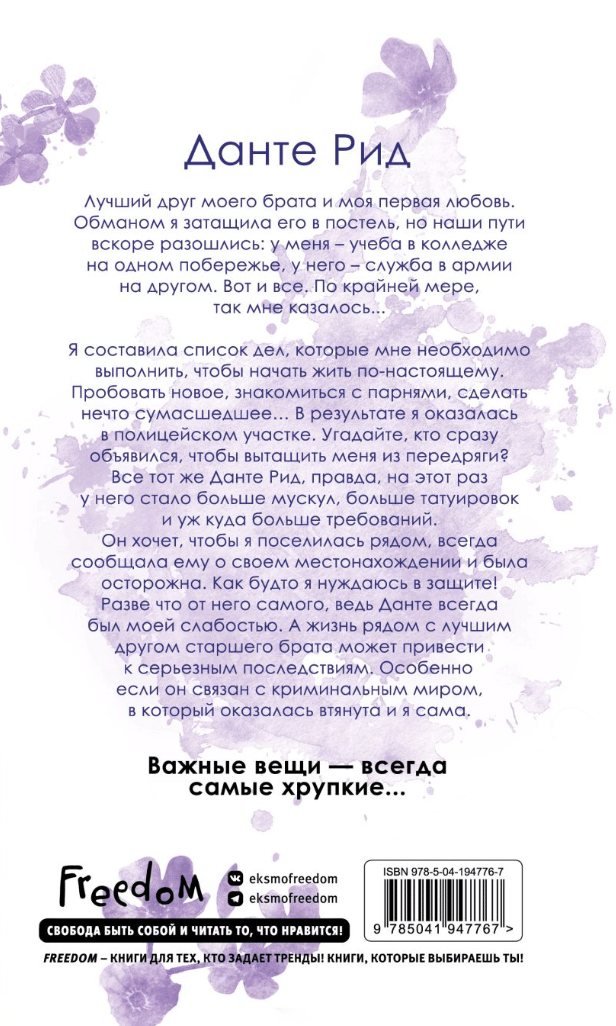 After graduation, I made a list of things I needed to do to start living my life for real. Travel, try new things, meet guys, do something crazy.... I ended up at the police station. Guess who showed up right away to get me out of trouble? Same old Dante Reed, but this time he's got more muscles, more tattoos, and a lot more demands. He wants me to settle in close, always let him know my whereabouts, and be careful. Like I need protection. Unless it's from him, because Dante's always been my weakness. And living next to your older brother's best friend can have serious consequences. Especially if he's connected to the criminal underworld I've been drawn into, because Dante isn't who he says he is....