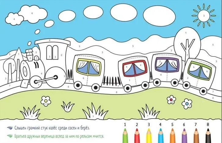 With the "On the Road" book from the "Color by Numbers" series, it's so easy to feel like a true artist! To make the pictures come to life and sparkle with vibrant colors, you need to color the parts correctly using the color cues. It's not at all difficult, very interesting, and most importantly, useful. These activities will spark your child's interest in creativity and also help develop attention, memory, and fine motor skills.