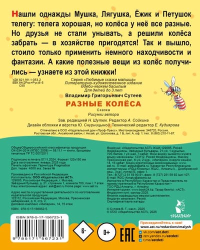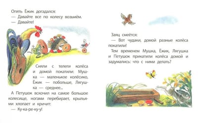 Found once Fly, Frog, Hedgehog and Rooster cart: the cart is good, but its wheels are all different. But the friends did not become discouraged, and decided to take the wheels - in the household will be useful! And so it turned out, just to apply a little resourcefulness and imagination. And what useful things from the wheels turned out – you will learn from this book!