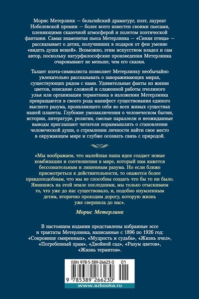 Maurice Maeterlinck, a Belgian playwright, essayist and poet, a Nobel Prize winner, is best known for his plays, which captivate with their fairy-tale atmosphere and flights of poetic fantasy. Maeterlinck's most famous play, The Blue Bird, tells the story of children who receive the gift of the ability to "see the souls of things" from a fairy. Perhaps the author himself possessed this skill, since Maeterlinck's natural philosophical works are no less enchanting than his fairy tales. The talent of a symbolist poet and the insight of an artist in love with nature allow Maeterlinck to tell in an unusually fascinating way about fascinating worlds, perhaps more harmonious than human society. Amazing facts about the life of various flowers, descriptions of the complex and well-coordinated work of a beehive or the organization of a termite mound are transformed in Maeterlinck's presentation not just into the notes of a naturalist, but into a kind of manifesto of the existence of a single supreme intelligence, manifesting itself in all living beings of our planet. Reflections on the life of plants, insects and animals, deep inferences about human existence, history, literature, religion, bold parallels and unexpected conclusions invite the reader to reflect on the formation of the human soul, on the desire of the individual to find his place in the surrounding world and to more deeply understand the connection with nature. This edition presents selected essays and treatises by Maurice Maeterlinck, written from 1896 to 1926: "The Treasure of the Humble", "Wisdom and Destiny", "The Life of Bees", "The Buried Temple", "The Double Garden", "The Intelligence of Flowers", "The Life of Termites".