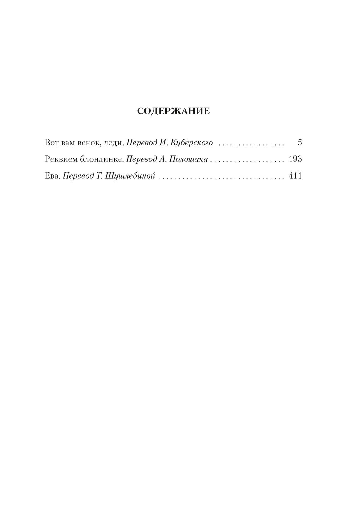 On account of Rene Raymond, known worldwide as James Hadley Chase, English writer and classic of the detective genre, several dozen novels, more than half of which were screened. The present collection presents works created at the dawn of literary activity. Action novels "Requiem for a blonde" and "Here's your wreath, lady" unfolds in small American towns. Blackmail and kidnapping, assassins and femme fatale beauty, a little "noir" and a little humor - fans of "cool detective" will not be disappointed. "Eve" is partly out of the usual for the author of the genre, but not inferior to other works of the master in the unexpectedness of denouement. In this novel, Chase acts as a shrewd connoisseur of human souls and a subtle psychologist. At the center of the story is a successful Hollywood screenwriter and writer, who, trying to get out of a creative dead end, conceived to write a new love story Scarlett O'Hara. And to make the book more convincing, the hero tries to play out the same story in real life, trying on the role of a man who can win the heart of a vicious beauty.