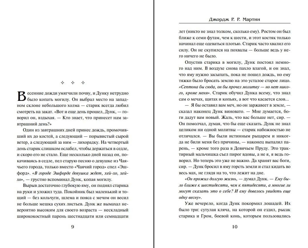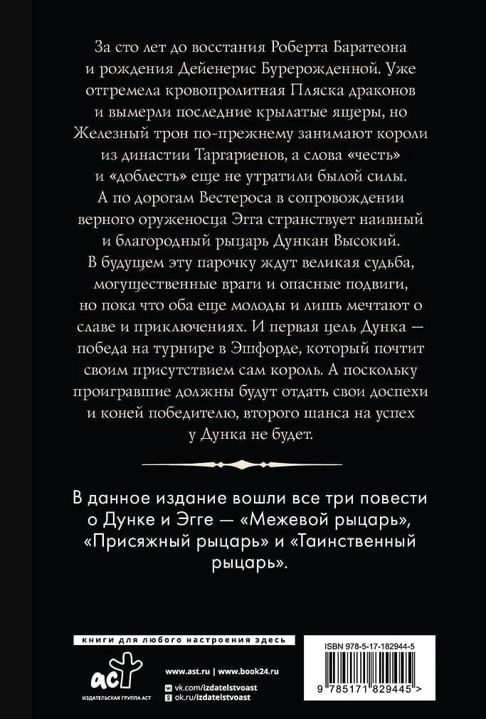 A hundred years before Robert Baratheon's rebellion and the birth of Daenerys Stormborn. The bloody Dance of the Dragons has died out, and the last winged lizards have become extinct, but the Iron Throne remains occupied by the Targaryen dynasty, and the words "honor" and "valor" have not yet lost their former power. Meanwhile, the naive and noble knight Duncan the Tall wanders the roads of Westeros, accompanied by his faithful squire, Egg. A great destiny, powerful enemies, and dangerous exploits await this pair, but for now, both are still young and dream only of glory and adventure. Dunk's first goal is victory in the tourney at Ashford, which the king himself will honor with his presence. Since the losers must surrender their armor and horses to the winner, Dunk will have no second chance at success. This edition includes all three stories about Dunk and Egg: "The Hedge Knight", "The Sworn Knight" and "The Mysterious Knight".