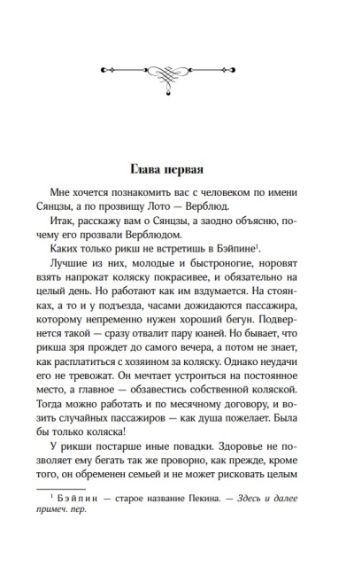 Lao She tells the story of one such puller, an orphan named Xiangzi, nicknamed Camel—a simple-minded and honest man whose cherished dream was to save up for his own wheelchair, ensuring a stable income and independence. Xiangzi is determined, denying himself everything; he works from dawn to dusk for four years and nearly achieves his cherished goal, but in one moment, the rickshaw puller loses everything...