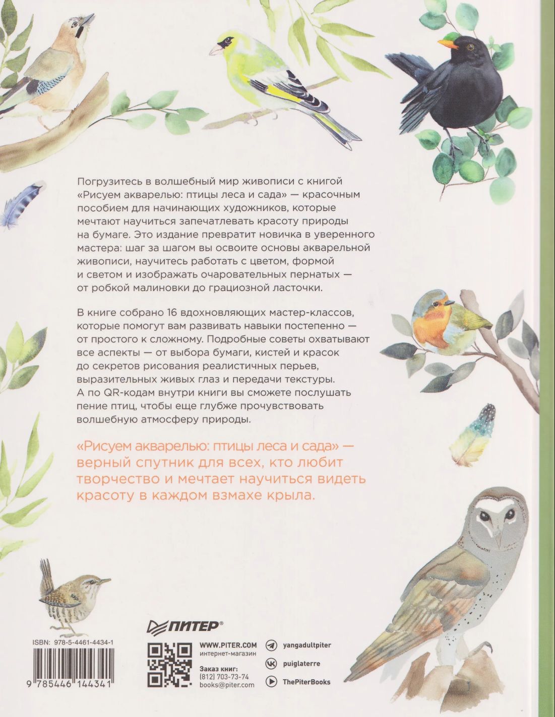 The book contains 16 inspiring master classes that will help you gradually develop your skills, from simple to complex. Detailed advice covers everything from choosing paper, brushes, and paints to the secrets of painting realistic feathers, expressive, vibrant eyes, and conveying texture. And using QR codes inside the book, you can listen to birdsong to further immerse yourself in the magical atmosphere of nature.