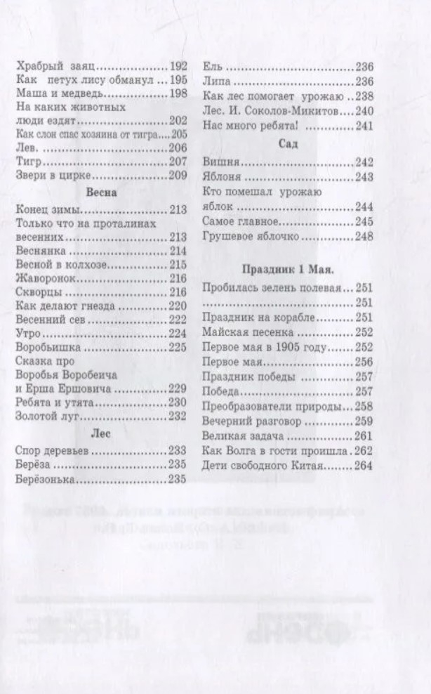 The manual not only familiarizes children with the best examples of Russian literature, but also provides initial information from different areas, such as natural phenomena and important historical events. The book contains fragments of works by Leo Tolstoy, N. Nekrasov, M. Lermontov, A. Tvardovsky, A. Fet, I. Krylov, A. Gaidar, A. Maykov, S. Mikhalkov, N. Nosov, A. Barto, V. Mayakovsky, S. Marshak, A. Chekhov, A. Pushkin, M. Prishvin, F. Tyutchev, M. Gorky, A. Kuprin, L. Kassil. All texts are accompanied by questions that help children to better digest what they have read and develop logical thinking.