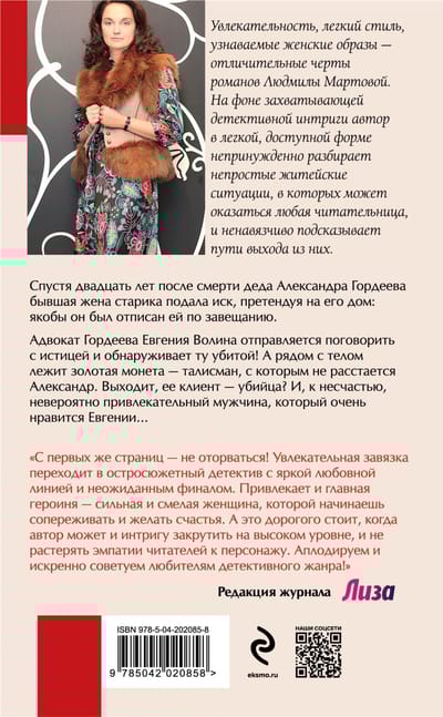 Twenty years after the death of grandfather Alexander Gordeev, the old man's ex-wife filed a lawsuit, laying claim to his house: allegedly, it was bequeathed to her by will. Gordeev's lawyer Evgenia Volina goes to talk to the plaintiff and finds her murdered! And next to the body lies a gold coin - a talisman that Alexander never parts with. It turns out that her client is a murderer? And, unfortunately, an incredibly attractive man who Evgenia really likes...