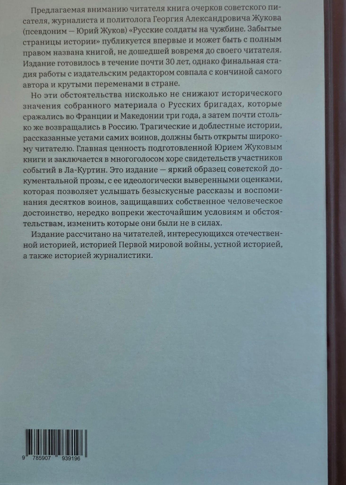However, these circumstances in no way diminish the historical significance of the collected material about the Russian brigades that fought in France and Macedonia for three years and then spent almost the same amount of time returning to Russia. The tragic and valiant stories, told by the soldiers themselves, should be accessible to a wide readership. The main value of Yuri Zhukov's book lies in the polyphonic chorus of testimonies from those who participated in the events at La Courtine. This publication is a shining example of Soviet documentary prose, with its ideologically rigorous assessments, allowing us to hear the unvarnished stories and recollections of dozens of soldiers who defended their own dignity, often despite the harshest conditions and circumstances they were powerless to change.