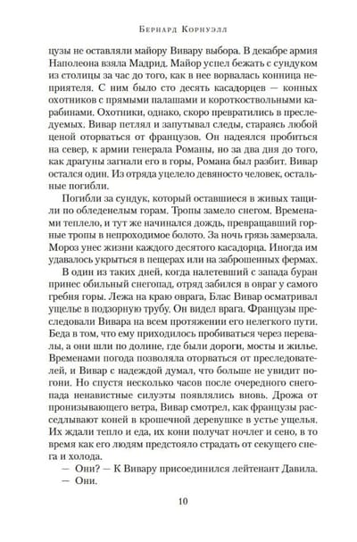 At the beginning of the nineteenth century, the British Empire stretched from the English Channel to the Indian Ocean. One of the architects of this empire, a participant in every war England waged at the time, was Rifleman Sharpe. In the novel "Rifleman Sharpe's Rifles," the hero's unit is surrounded by French troops, who are winning victory after victory on the Iberian Peninsula. Spanish cavalry help Sharpe escape ignominious capture. But everything comes at a price, and Sharpe must take part in a suicidal attempt to liberate the sacred Spanish city of Santiago de Compostela. In the novel "Rifleman Sharpe's War," Napoleon's troops rush to capture Portuguese territory, and no one knows whether the small British contingent will engage the enemy or whether the British will be ordered to return home. But Sharpe has his own war. He is tasked with finding Kate Savage, the daughter of a wealthy English merchant...