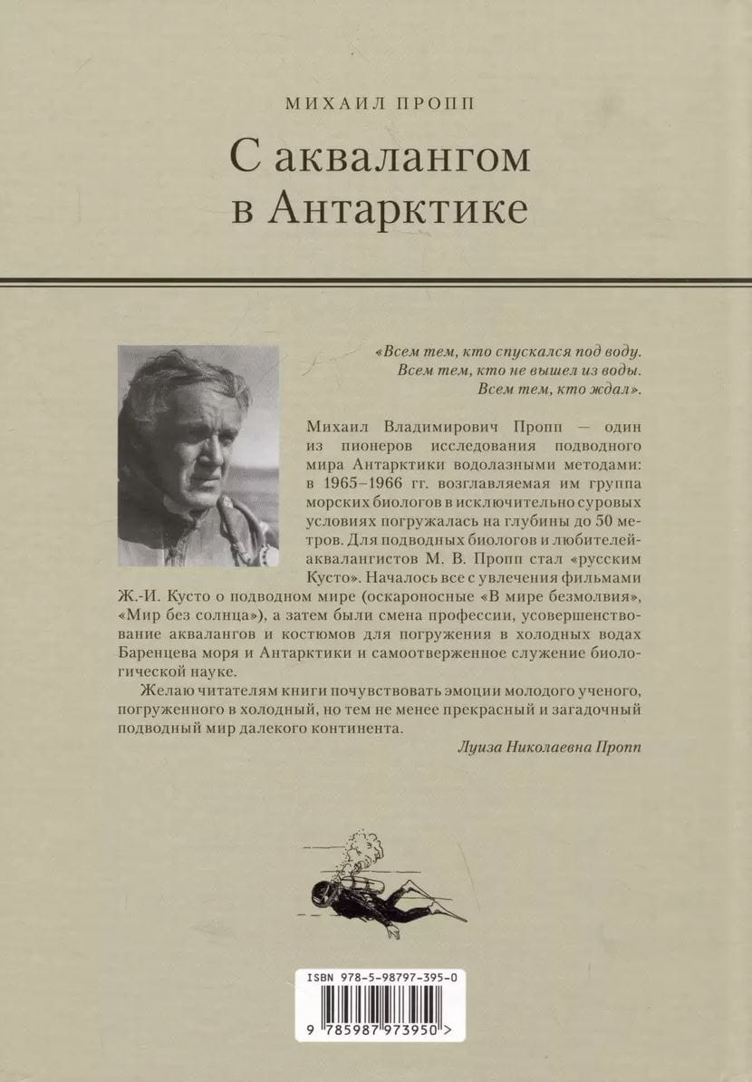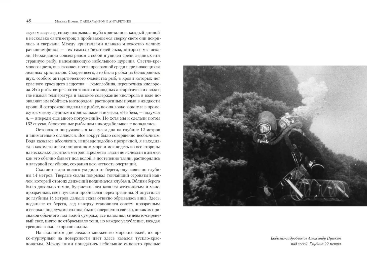 In the Antarctic summer of 1965/66, experienced biologists and scuba divers Mikhail Propp, Evgeny Guzov and Alexander Pushkin were the first to descend under two-meter-thick fast ice near the Soviet Antarctic station Mirny. Working in extremely difficult conditions at depths of up to 50 meters, they discovered an unusually diverse underwater world there, collected a rich collection of flora and fauna samples, and discovered species previously unknown to science. It turned out that sponges, corals, sea anemones, ascidians, starfish, sea urchins and lilies live under the ice on the Antarctic shelf. The richness of the underwater world here resembled the population of tropical seas. Many of the species discovered were previously unknown to science. The results of the under-ice research conducted by M. V. Propp's group made it possible to eliminate the blank spot that existed in the overall picture of the coastal waters of Antarctica and created the basis for reconstructing the history of the formation of the fauna of this region. At the same time, they proved the availability of scientific work under the Antarctic ice. Of course, one can say that this event is incomparable with a flight into space, but it was a new and dangerous undertaking that brought a fundamentally new vision of the Southern Ocean. Similar studies were simultaneously started by American biologists in the Ross Sea at McMurdo Station. But still, Mikhail Vladimirovich Propp and his colleagues were the first researchers to discover the unique under-ice world of Antarctica to the world. Based on the results of the expedition, M. V. Propp published a book in 1968 in which he described not only the underwater inhabitants, but also the habits of penguins and seals, spoke about the difficulties of under-ice diving, about the life of polar explorers at Mirny Station. The reissue of this book, illustrated with the author's photographs, continues the "Polar Series" of the Paulsen publishing house.