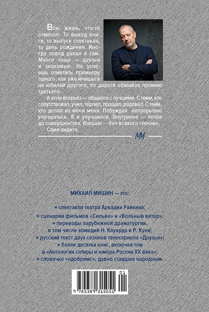 "I decided to collect in a book some of the people who influenced my biography," writes Mikhail Mishin in the foreword. The renowned writer, playwright, translator, and winner of numerous awards for satire and humor has included in this collection texts dedicated to his famous friends and colleagues. Among them are Arkady Raikin, Mikhail Zhvanetsky, Alexander Shirvindt, Marina Neyolova, Semyon Altov, Eldar Ryazanov, Grigory Gorin, Arkady Arkanov, Mikhail Kozakov, Zinovy Gerdt, Klara Novikova, and Yuli Kim. The book "With Whom I Congratulate Myself" also includes counter-messages addressed to Mikhail Mishin himself.